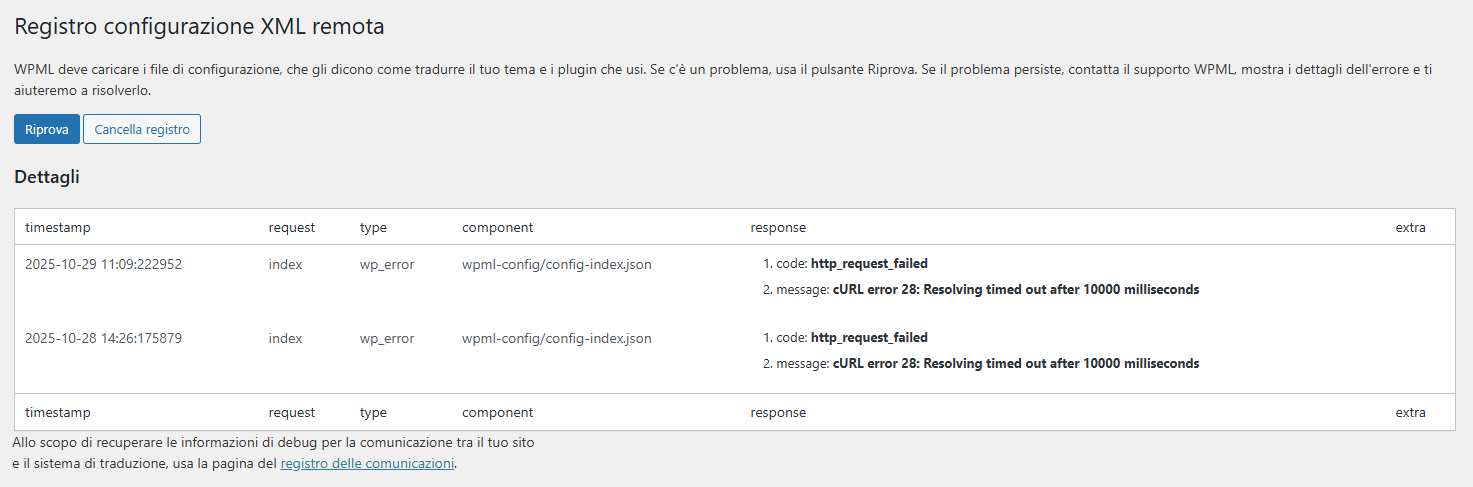 Nel registro configurazione XML remota > Dettagli ho due segnalazioni e nel registro di comunicazione ho questo errore: artner":false,"review_url":"https://wpml.org/submit-your-review/?parent_translation-service_id=703707","uses_ate":false,"self_registered":false,"recommended_maximum_number_of_jobs_per_batch":0,"auto_refresh_project_options":false,"custom_fields":[{"label":"API token","name":"api_token","type":"text"}],"default_service":0,"translation_feedback":true,"feedback_forward_method":"manual","rankings":{"quality":0,"quality_ranking":0.0,"speed":0,"speed_ranking":0.0,"popularity":1,"popularity_ranking":1.83,"primary":0.0,"primary_ranking":1.83},"ratings":{"wpml_average_user_rating":0.0},"specializations":[],"countries":[],"certifications":[],"redirect_to_ts?":true},{"id":26,"name":"POEditor","description":"Warning! To achieve the best results please use POEditor for strings translation only. POEditor is a collaborative platform, built to easily manage the translation of apps, websites or related software, in a team or independently, and to automate the localization workflow.","url":"https://wpml.org/go/poeditor/","logo_url":"enlace oculto","logo_preview_url":"enlace oculto","project_details_url":"enlace oculto{project_id}","add_language_pair_url":"","custom_text_url":"","select_translator_iframe_url":"","translator_contact_iframe_url":"","quote_iframe_url":"","has_translator_selection":false,"project_name_length":128,"suid":"97956a8eed5fa652b8c2ec2b9eda6988","doc_url":"https://wpml.org/translation-service/poeditor/","notification":false,"tms":true,"has_language_pairs":false,"deadline":false,"oauth":false,"oauth_url":"","popup_message":"","how_to_get_credentials_desc":"Your API Token is located under \"Account Settings \u003e API Access\" tab on your POEditor Dashboard","how_to_get_credentials_url":"https://wpml.org/translation-service/poeditor/#retrieving-api-token","client_create_account_page_url":"https://wpml.org/translation-service/poeditor/#creating-a-poeditor-account","partner":false,"review_url":"https://wpml.org/submit-your-review/?parent_translation-service_id=1144568","uses_ate":false,"self_registered":false,"recommended_maximum_number_of_jobs_per_batch":0,"auto_refresh_project_options":false,"custom_fields":[{"label":"API token","name":"api_token","type":"text"}],"default_service":0,"translation_feedback":true,"feedback_forward_method":"manual","rankings":{"quality":0,"quality_ranking":0.0,"speed":0,"speed_ranking":0.0,"popularity":1,"popularity_ranking":1.67,"primary":0.0,"primary_ranking":1.67},"ratings":{"wpml_average_user_rating":0.0},"specializations":[],"countries":[],"certifications":[],"redirect_to_ts?":true},{"id":179,"name":"Diction","description":"Diction is an international language services provider based in Eastern Switzerland. Diction is ISO-certified and committed to providing personal service, efficient processes and qualified experts. Send and manage every aspect of your project with the specially developed Diction WordPress plug-in.","url":"https://wpml.org/go/diction/","logo_url":"https://tp-cdn.wpml.org/production/logos/diction-7189140e62d97d7052d2.png","logo_preview_url":"https://tp-cdn.wpml.org/production/logos/preview_diction-7189140e62d97d7052d2.png","project_details_url":"","add_language_pair_url":"","custom_text_url":"","select_translator_iframe_url":"","translator_contact_iframe_url":"","quote_iframe_url":"","has_translator_selection":false,"project_name_length":128,"suid":"a1cde9d1139bc8355215831552a02bb0","doc_url":"https://wpml.org/translation-service/diction-ag/","notification":true,"tms":false,"has_language_pairs":true,"deadline":false,"oauth":false,"oauth_url":"","popup_message":"","how_to_get_credentials_desc":"","how_to_get_credentials_url":"","client_create_account_page_url":"","partner":true,"review_url":"https://wpml.org/submit-your-review/?parent_translation-service_id=11322249","uses_ate":false,"self_registered":false,"recommended_maximum_number_of_jobs_per_batch":0,"auto_refresh_project_options":false,"custom_fields":[{"label":"Token","name":"api_token","type":"text"}],"default_service":0,"translation_feedback":true,"feedback_forward_method":"manual","rankings":{"quality":0,"quality_ranking":0.0,"speed":0,"speed_ranking":0.0,"popularity":1,"popularity_ranking":0.75,"primary":0.0,"primary_ranking":0.75},"ratings":{"wpml_average_user_rating":0.0},"specializations":[],"countries":[{"name":"Canada","code":"CA"},{"name":"Switzerland","code":"CH"}],"certifications":[{"name":"ISO-17100","key":"17100"},{"name":"ISO-9001","key":"9001"},{"name":"ISO-18587","key":"18587"}],"redirect_to_ts?":false},{"id":150,"name":"interlanguage","description":"Managing translations in WPML is easy with interlanguage, a leading ISO 17100-certified translation company specializing in human translation of websites, with a focus on Italian. Interlanguage brings SEO knowledge coupled with 35 years’ industry experience.","url":"https://wpml.org/go/interlanguage1/","logo_url":"enlace oculto","logo_preview_url":"enlace oculto","project_details_url":"","add_language_pair_url":"","custom_text_url":"","select_translator_iframe_url":"","translator_contact_iframe_url":"","quote_iframe_url":"","has_translator_selection":false,"project_name_length":128,"suid":"8c6a2208f1cfb947ae3d5f21f2bc2f2f","doc_url":"https://wpml.org/translation-service/interlanguage/","notification":true,"tms":false,"has_language_pairs":true,"deadline":true,"oauth":false,"oauth_url":"","popup_message":"","how_to_get_credentials_desc":"","how_to_get_credentials_url":"","client_create_account_page_url":"","partner":true,"review_url":"https://wpml.org/submit-your-review/?parent_translation-service_id=9536059","uses_ate":true,"self_registered":false,"recommended_maximum_number_of_jobs_per_batch":0,"auto_refresh_project_options":false,"custom_fields":[{"label":"API token","name":"api_token","type":"text"}],"default_service":0,"translation_feedback":false,"feedback_forward_method":"api","rankings":{"q