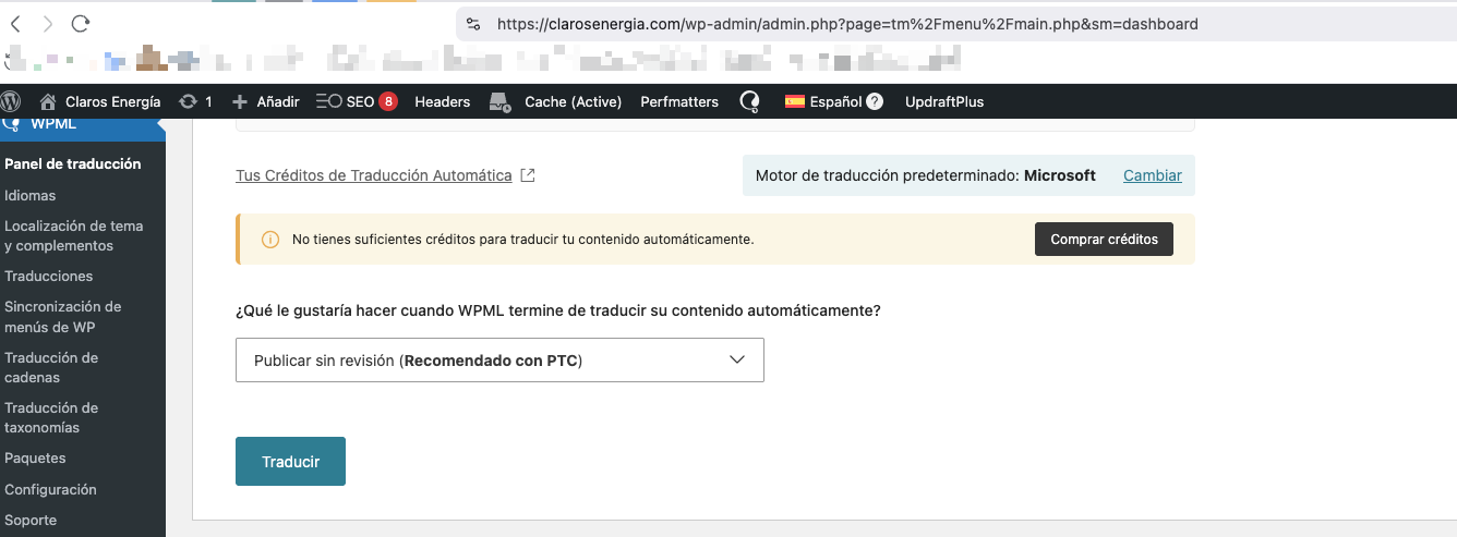 Después de migrar un sitio de desarrollo a producción, los créditos de WPML para traducción automática desaparecieron y no se mostraban correctamente en el nuevo sitio de producción, a pesar de haber añadido créditos adicionales.
