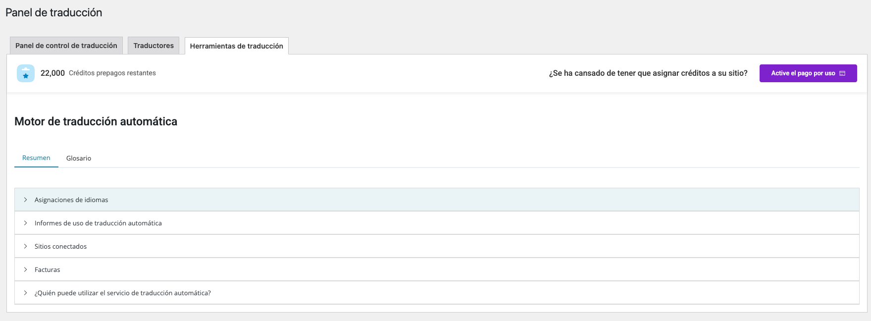 6. Activa el Editor de Traducción Avanzado de WPML para habilitar las pestañas de gestión de créditos.