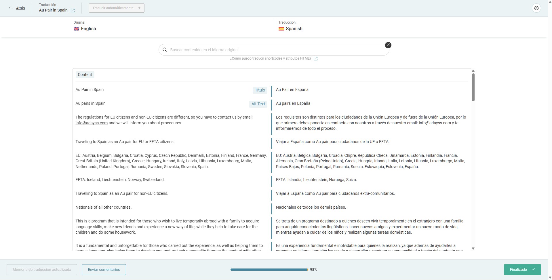 Estoy haciendo la traducción al español de la página Au Pair in Spain en el sitio enlace oculto. He traducido y guardado todos los bloques.