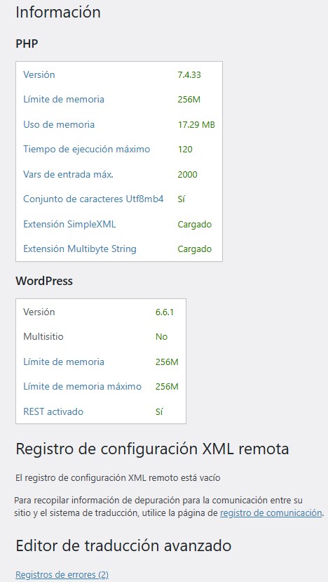 Los valores actuales se pueden ver en WPML > Soporte > WordPress.