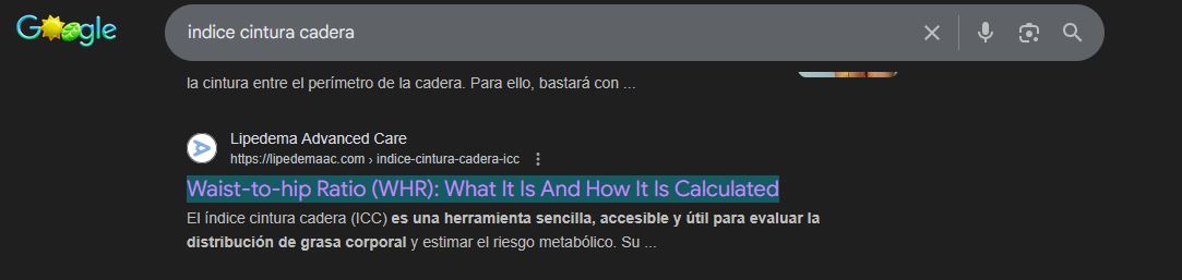 Al buscar en Google en España, los títulos aparecen en inglés en lugar de español, afectando al CTR y posicionamiento. Por ejemplo, al buscar 'indice cintura cadera', el título aparece en inglés para la URL 'enlace oculto'. Se adjunta imagen