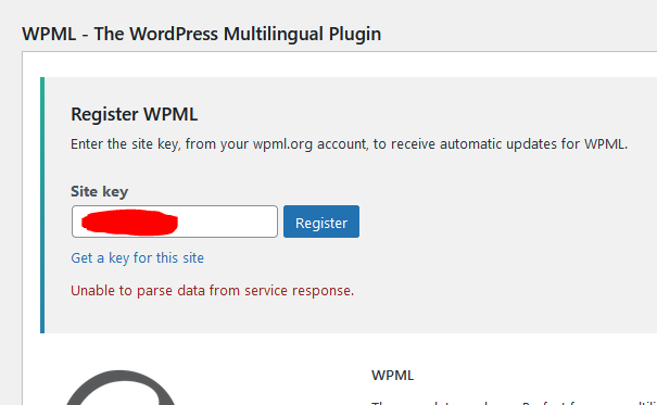He activado otra página de wordpress para usar el plugin. Al intentar meter la clave recibo este error: "Unable to parse data from service response."