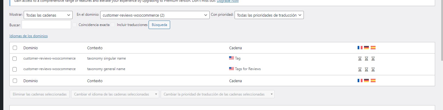 1. Visita el hilo de soporte de los autores del plugin Customer Reviews for WooCommerce en https://wordpress.org/support/topic/wpml-reviews-translated/ donde se indica que la traducción de reseñas se puede realizar a través de WPML -> Traducción de cadenas.