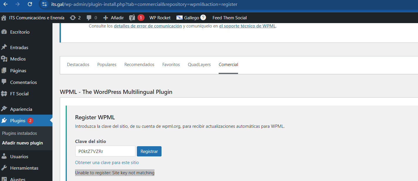 No puedes registrar WPML en tu web a pesar de tener una licencia activa. El error que aparece es 'Unable to register: Site key not matching'.