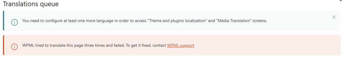 Estás intentando traducir páginas de inglés a español en tu sitio web usando WPML, pero WPML intentó traducir la página tres veces y falló, mostrando el mensaje de error que sugiere contactar al soporte de WPML.