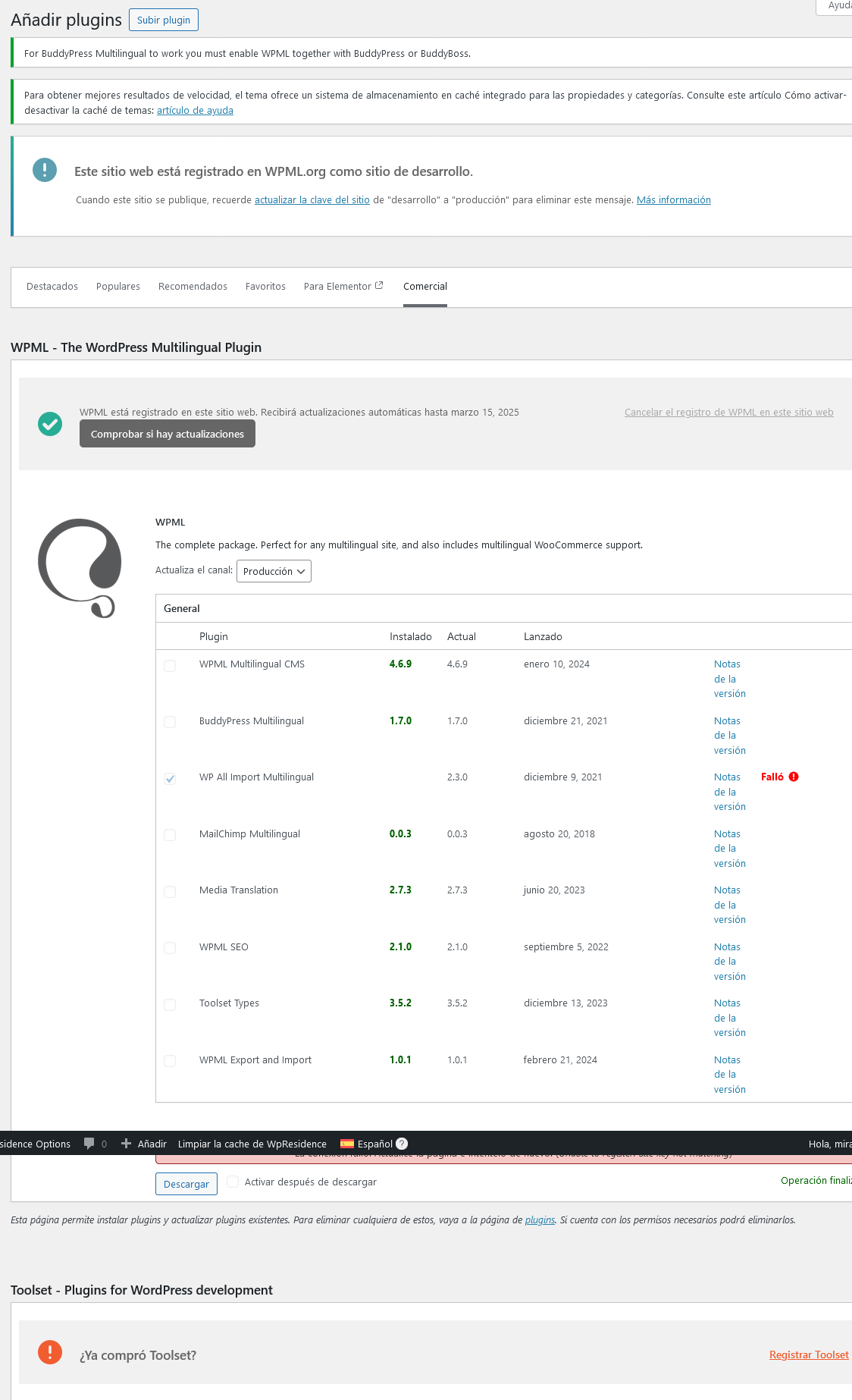 El cliente experimentó un fallo al instalar el componente WP All Import Multilingual, recibiendo el error "PCLZIP_ERR_BAD_FORMAT".