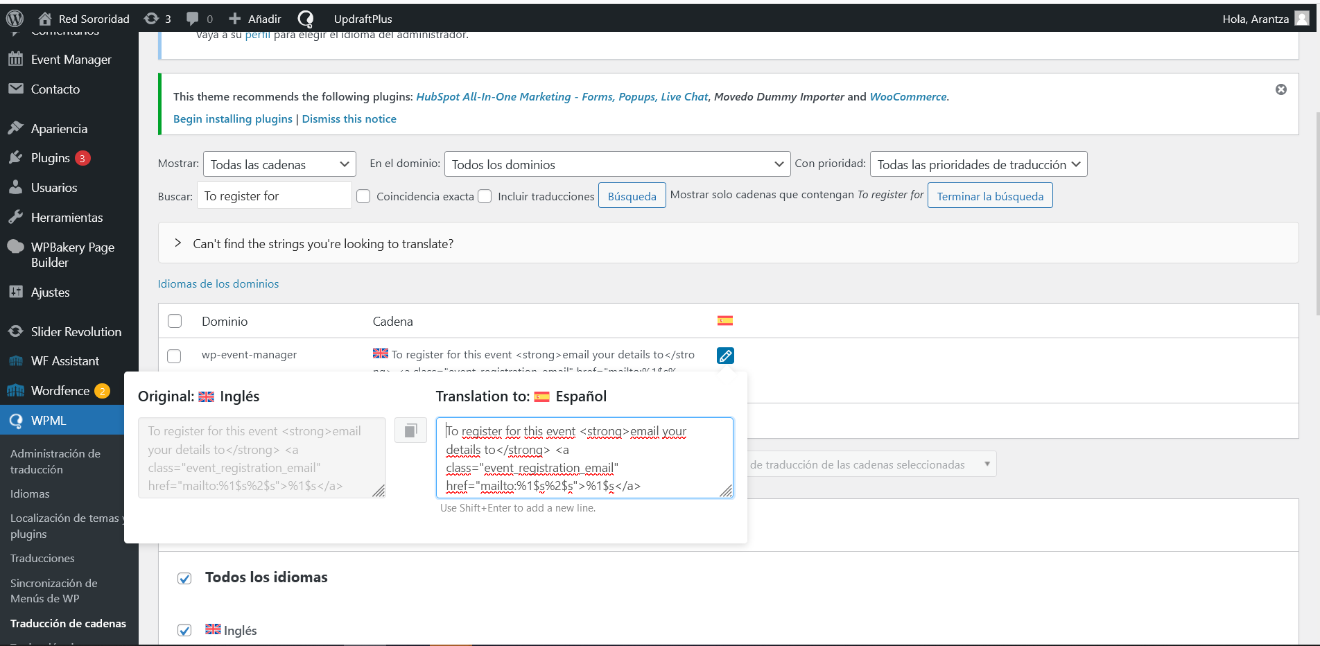 Para traducir textos que provienen del plugin, utiliza WPML --> Traducción de cadenas.