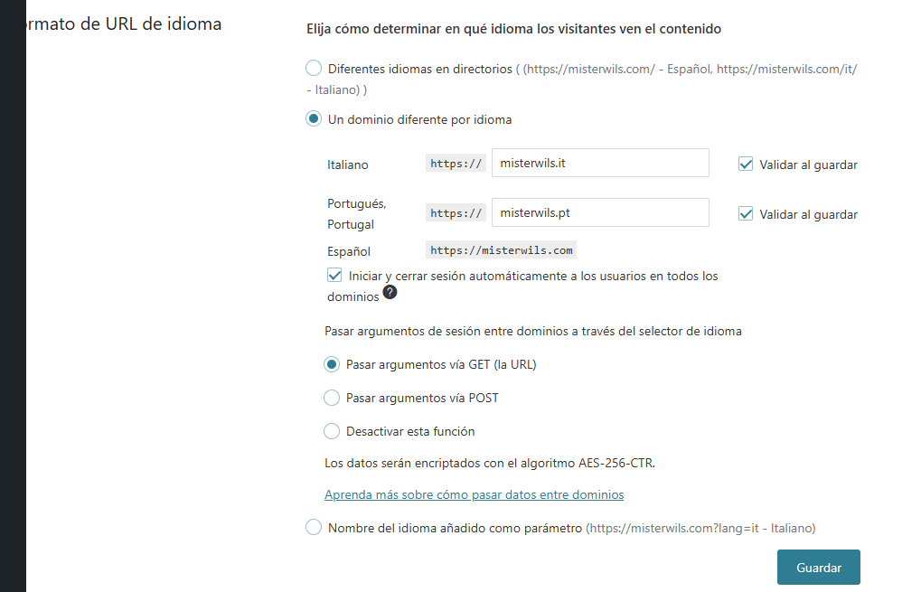 Ahora bien, te quería preguntar una cosa, actualmente tengo los idiomas adicionales en la web principal misterwils.com como dominios independientes (adjunto imagen). El idioma inglés debe ir al dominio misterwils.eu, y claro, actualmente tengo un wordpress ahi. ¿Cómo puedo hacer la traducción de inglés sin estar vinculado al dominio .eu para que una vez esté finalizada la traducción completa lo vincule al dominio .eu? Así mienstras hacemos la traducción no perdemos la web actual misterwils.eu