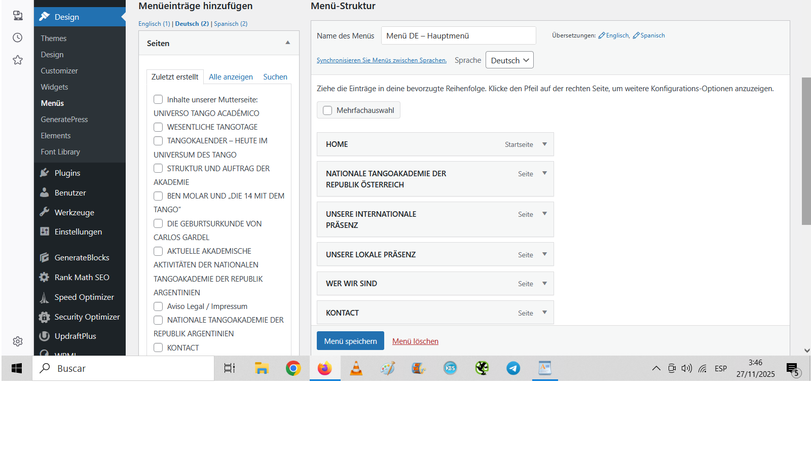 Para mi sitio enlace oculto, donde uso GeneratePress Premium, hago mis traducciones manualmente en Alemán (página principal), Inglés y Español. Tengo tres idiomas: Alemán (principal), Español e Inglés. Todos los menús están creados correctamente en cada idioma y todas las páginas están conectadas entre sí como traducciones. WPML está instalado y funcionando sin errores aparentes. Intenté crear el selector desde WPML → Sprachen → Menü-Sprachumschalter, borrar y crear nuevamente el selector, revisar que los tres menús estén asignados a 'Menú principal' en sus respectivos idiomas, limpiar el caché del hosting y del tema, y verificar que no haya errores visibles en el backend.