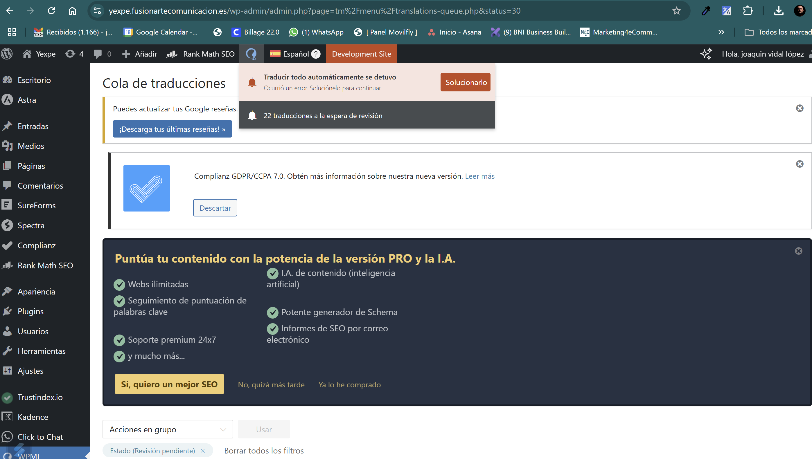 El cliente ha comprado créditos para traducción automática en WPML, pero el sistema sigue indicando que compre más créditos, a pesar de haber realizado la compra dos veces.