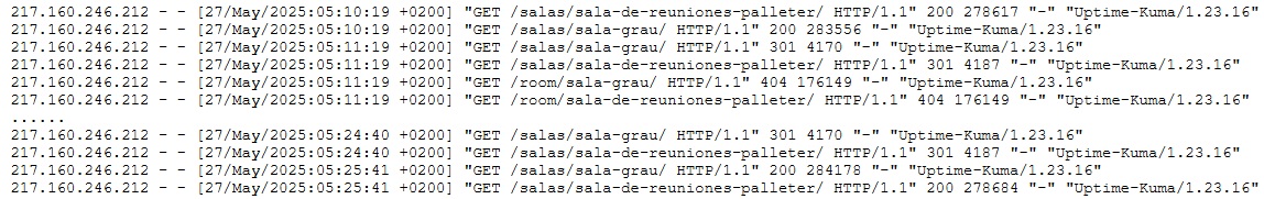 Hola, ya creamos una versión de prueba de la web, le pasamos los datos de acceso a tu compañero; de momento allí no ha saltado el error, por lo que no podemos hacer pruebas. Lo que hicimos en la web publicada es desactivar WP Rocket, y incluso ahí también lanzaba el error. Te he adjuntado una captura del log; Uptime-Kuma es el programa que usamos para monitorizar. Como puedes ver, a las 05:10 el acceso a la URL /salas/sala-de-reuniones-palleter/ devuelve un código 200, pero un minuto después ya hace una redirección a /room/sala-de-reuniones-palleter/, que devuelve un 404. Esto sigue fallando hasta que a las 05:25 vuelve a funcionar, devolviendo un código 200; en este caso no se ha accedido al backoffice, por lo que el error se ha solucionado automáticamente, pero lo que si hemos visto es que si nos logueamos inmediatamente después de detectar la redirección el error se soluciona. Espero que te sirva de ayuda. Un saludo. |