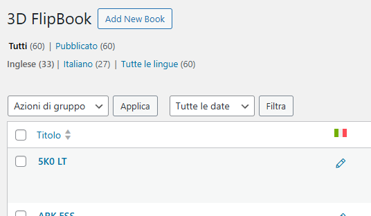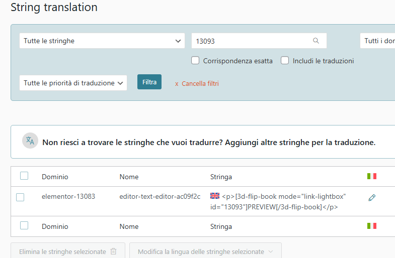 Ho un sito sviluppato con Elementor Pro e il tema Hello Elementor. Quando modifico un testo o un'immagine in una pagina che contiene lo shortcode di 3D Flipbook, devo aggiornare anche la traduzione della stringa dello shortcode in Traduzione Stringhe. Inserisco lo shortcode tramite il widget testo per modificarne l'aspetto visibile.