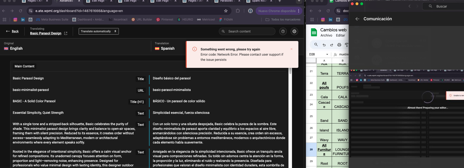 El cliente está intentando traducir varias páginas de su sitio web a otros idiomas utilizando el plugin WPML, pero enfrenta problemas con el reflejo incorrecto de las traducciones y errores constantes en el Editor de Traducción Avanzado.