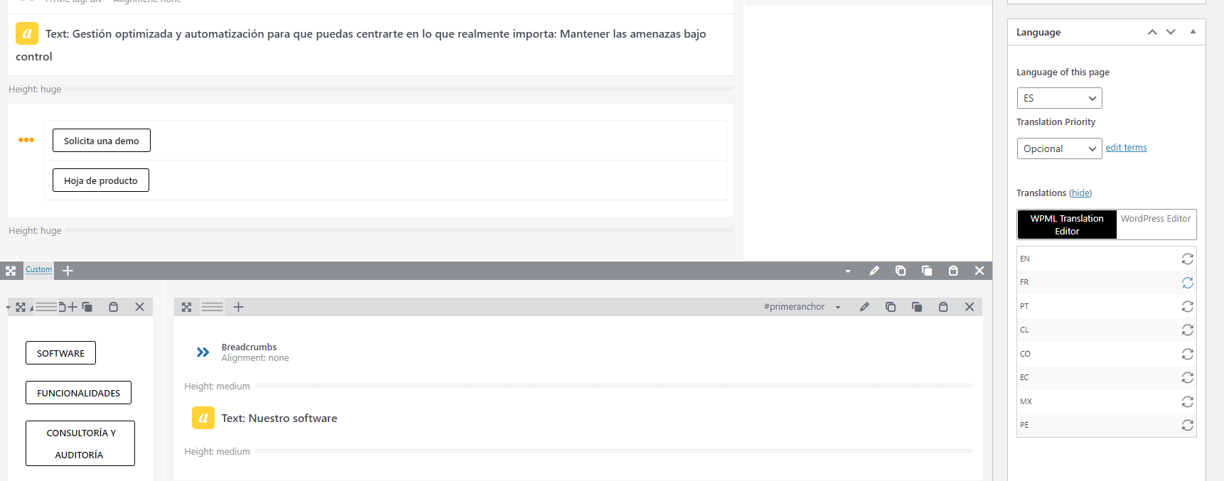 Estoy tratando de actualizar las traducciones de algunas páginas ya traducidas como por ejemplo: enlace oculto Se lanza bien el wpml translation editor, pero cuando le doy a complete se queda actualizando y ningún momento se ve el lapicero como que se ha quedado 100% correctamente. Además, en la sección de error logs tengo bastantes: 2023/12/20 9:02:55 AM Job Download htmlspecialchars_decode(): Argument #1 ($string) must be of type string, array given /srv/www/vhosts/www.globalsuitesolutions.com/wp-content/plugins/sitepress-multilingual-cms/addons/wpml-page-builders/classes/Shared/st/strategy/shortcode/class-wpml-pb-update-shortcodes-in-content.php:203 6905 84991578 {"downloadUrl":"https:\/\/ate-production.s3proxy.wpml.org\/translated_xliffs\/xliffs\/058\/609\/185\/original\/translated_83736763_Seguridad_de_la_informaci_n_ISO_2700120231212-1630668-1c0zdjd.xliff20231212-1630738-2wosdz.xliff?Expires=1703667766&Signature=SKzUCa88khLYTbXKyfmBT8OeaNMWsKrfD1sQUEK183adagfzyZCRc2vehKukpz2wMTZjrgSO2MMPee9ArBWAhpkC7kL4YwvfTqtxBfZCYIalWMnHJgVH3iJBfVc2fdOdx28fmrJQ1g3LtH3FLQBDonk1bcKVS9x1vkoRkUexMnZDD~dqEPhDtiw1cEu-YaRtPJr2QAA8-Fevl6sPr3V9SYOe3Av0htCeEvzbboxUEJjjuxr~DOMcb-7FaS0GHfOaJin-yR29NBxlZg-gCv1cbunTehOu8pxEdnyHHvic8ChZpckk-kkwj4y922KkLurBcnRk5C7EaXWRoU~y3UDzHA__&Key-Pair-Id=K1C11UVRQNXLRQ"} Te |