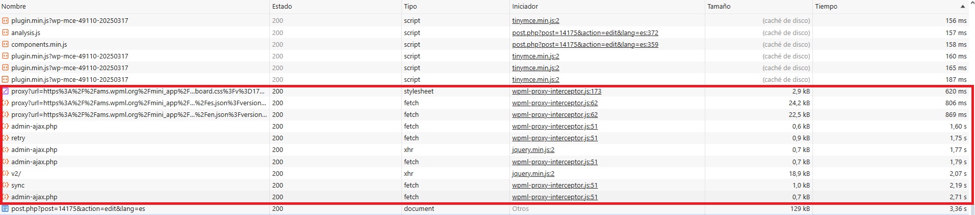 Al respecto, observarás que el archivo wpml-proxy-interceptor.js está produciendo una ralentización adicional que debería ser optimizada.