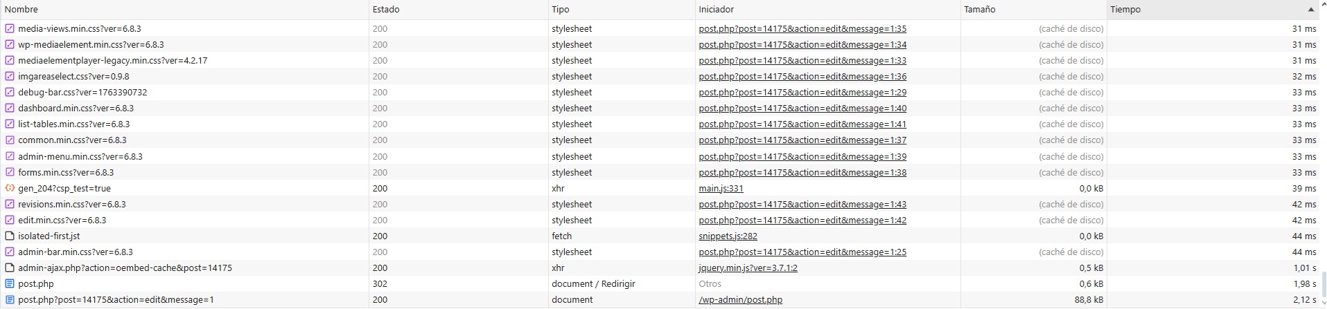Los tiempos de carga del backend son extremadamente lentos, especialmente al guardar cambios en productos y posts. Las soluciones intentadas no han resuelto el problema.