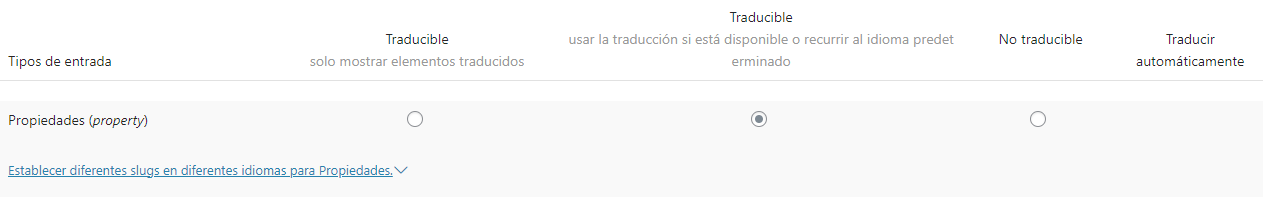 Está intentando que los anuncios de propiedades creados en el idioma predeterminado (español) aparezcan en todos los idiomas sin traducir el contenido, y que sean accesibles desde cualquier idioma. Sin embargo, enfrenta problemas cuando los anuncios se crean en un idioma que no es el predeterminado, ya que no aparecen en los demás idiomas.