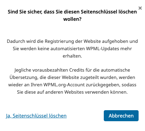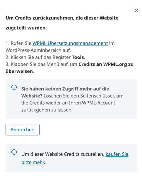 Die Credits sind nicht in meinem WPML-Account erschienen, obwohl ich den Seitenschlüssel gelöscht habe.