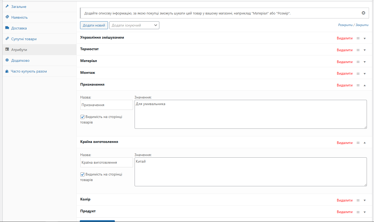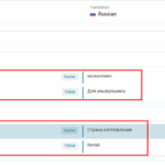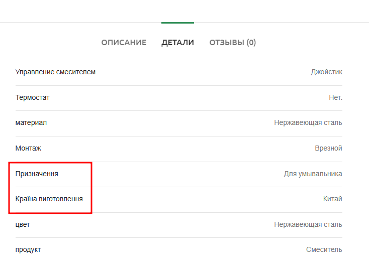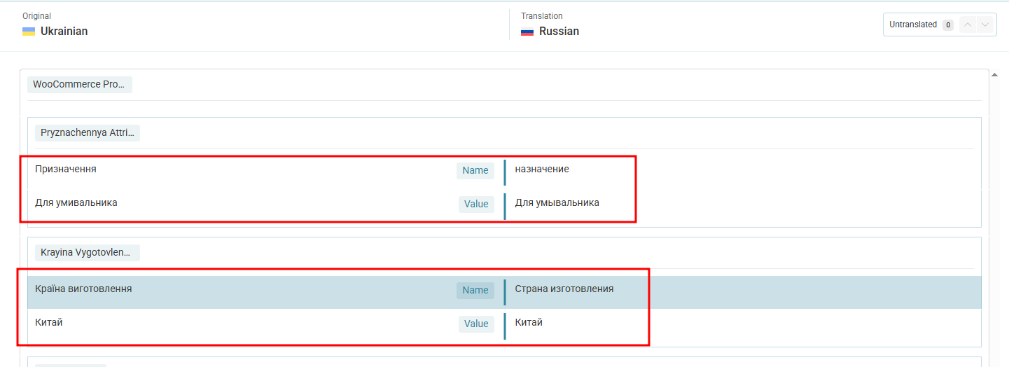 Two attribute names, 'Призначення' and 'Країна виготовлення', have no translation on the site page, although the attribute values are translated. The translation appears correct in the advanced translation editor, but these two attribute names are missing translations on the site page.