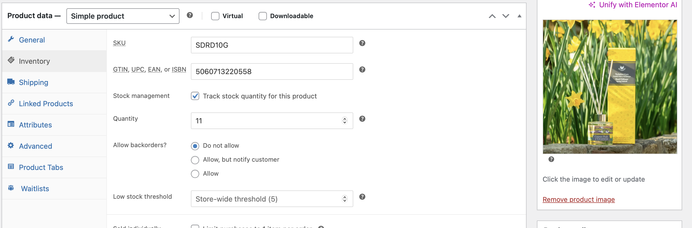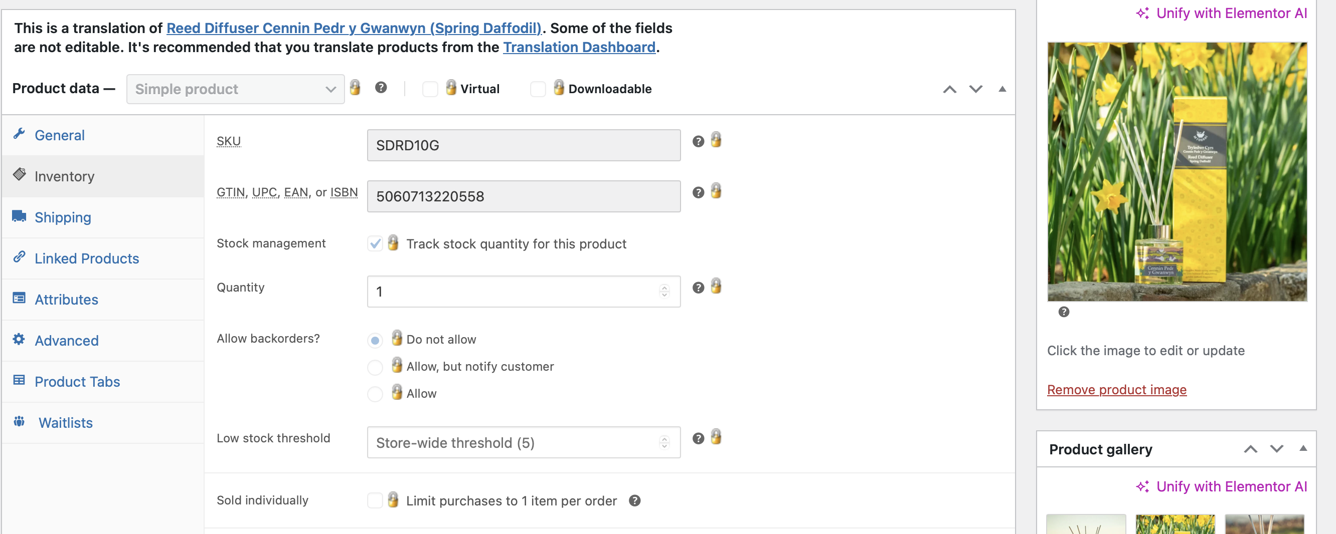 I am trying to manage stock levels for a product in different languages on my WordPress site using WPML. Specifically, the English version of the diffuser shows a stock level of 11, while the Welsh version shows a stock level of 1. The field is locked together, and I am unsure how to resolve this discrepancy. You can see the issue on this page: enlace oculto