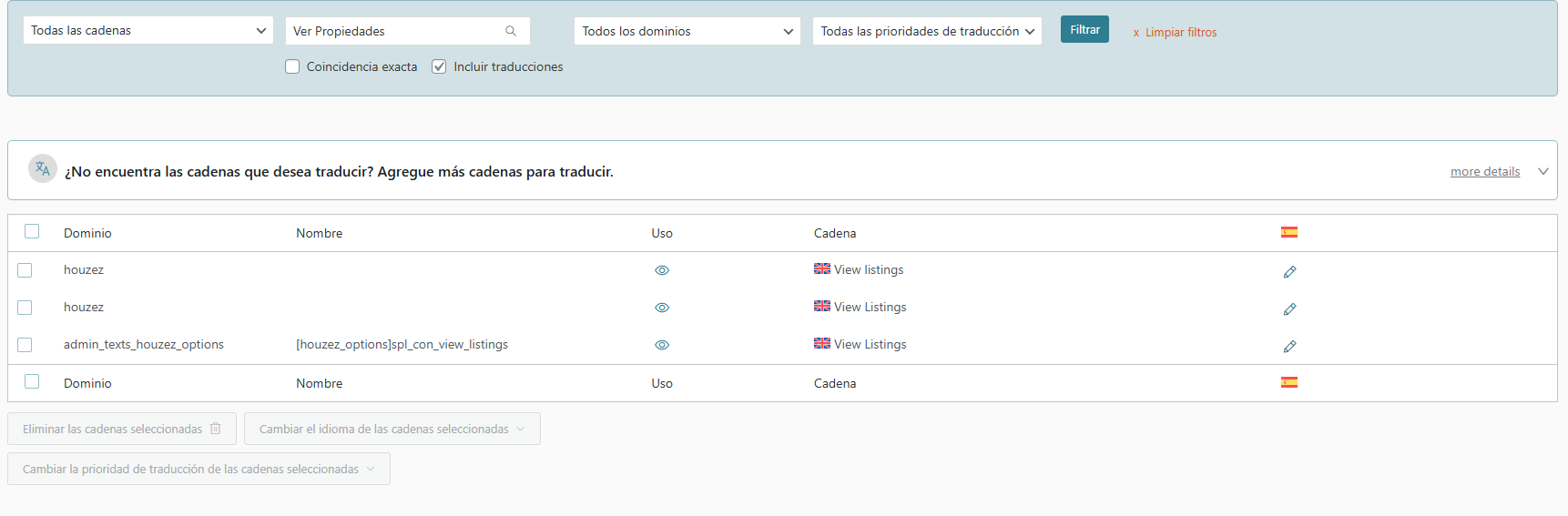 En esa caso aparecen las que muestro en la imagen en inglés "View Listings" y su traducción en español pero en la url de inglés sigo viendo la palabra en español y así con varias cadenas.
