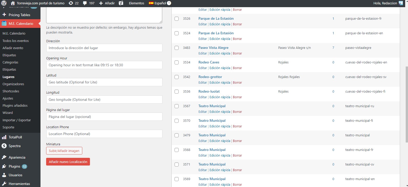 El cliente tiene un sitio multilingüe con español como idioma principal y ha instalado el plugin 'Modern Events Calendar PRO' (MEC). Al crear un lugar para un evento y traducirlo automáticamente a otros idiomas con WPML, el campo 'LUGARES' se duplica, creando una entrada por cada idioma, en lugar de usar el mismo lugar para todas las traducciones.