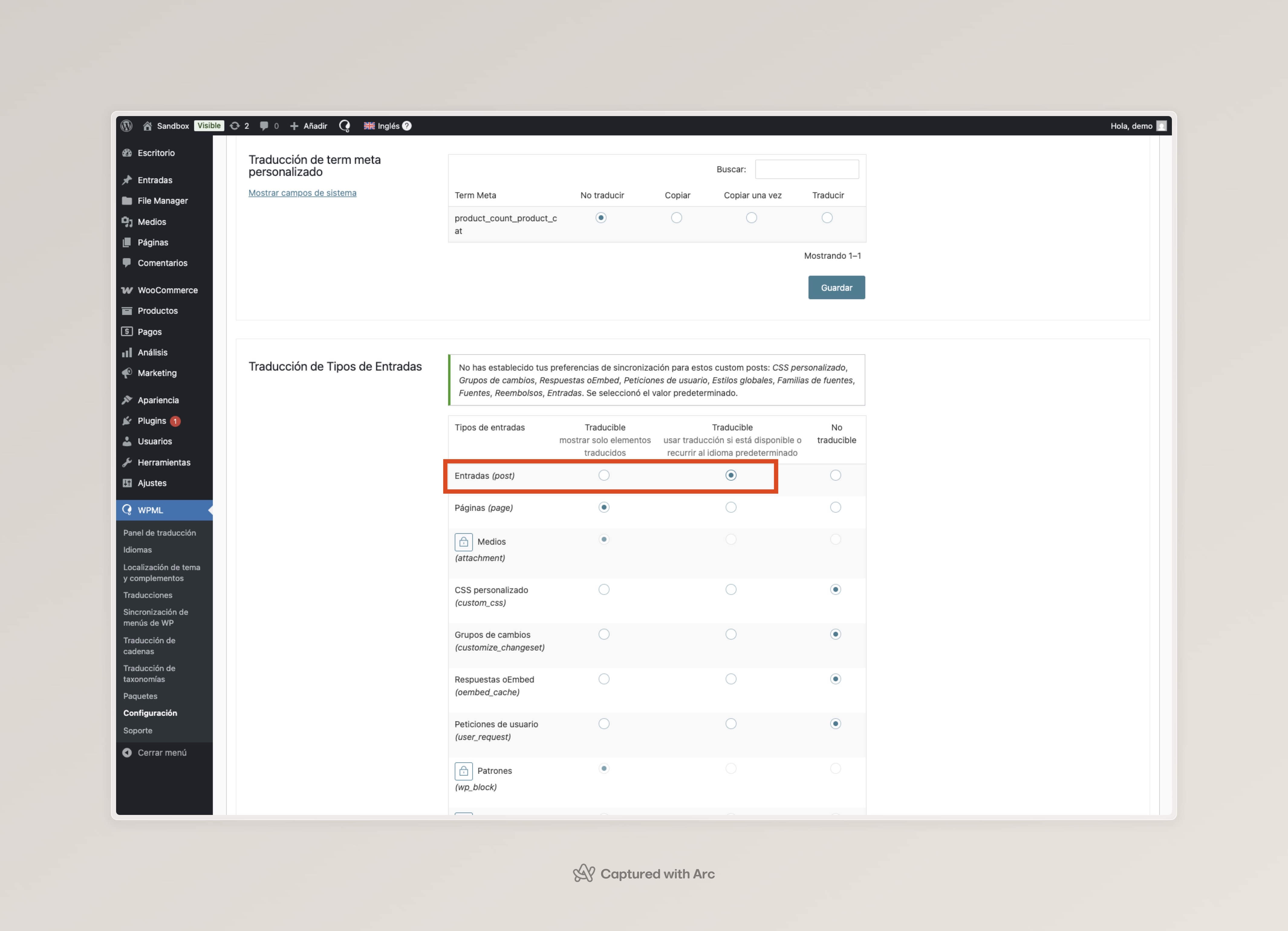 3. Ve a WPML > Configuraciones > Traducción de Tipos de Entradas y asegúrate de que la opción "Entrada" esté marcada como traducible. Esto debería permitirte ver y cambiar el idioma de las entradas directamente desde el editor de entradas.
