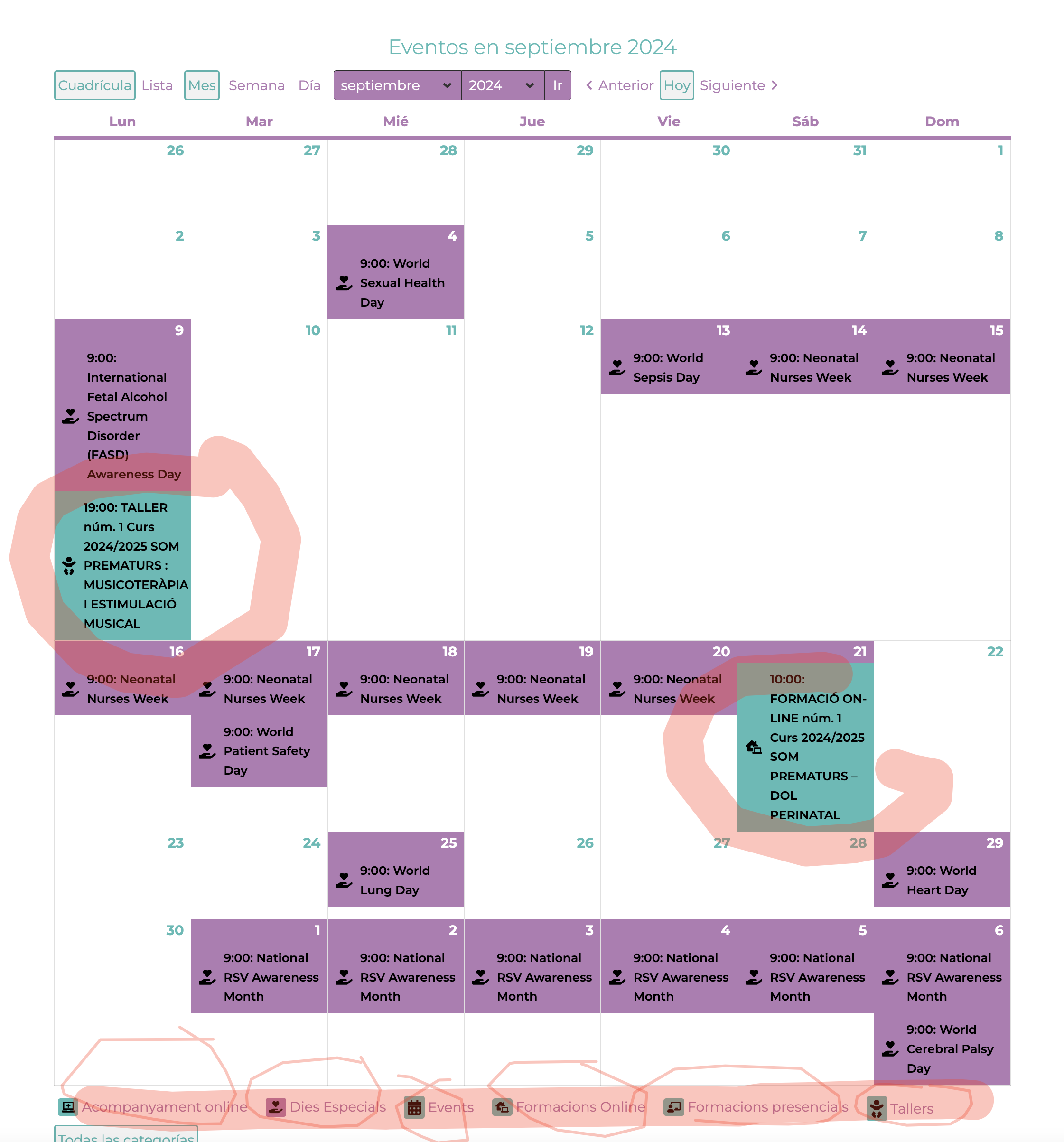 El cliente tiene dificultades para traducir eventos y categorías de eventos del plugin My Calendar al español en la landing page de su sitio web.