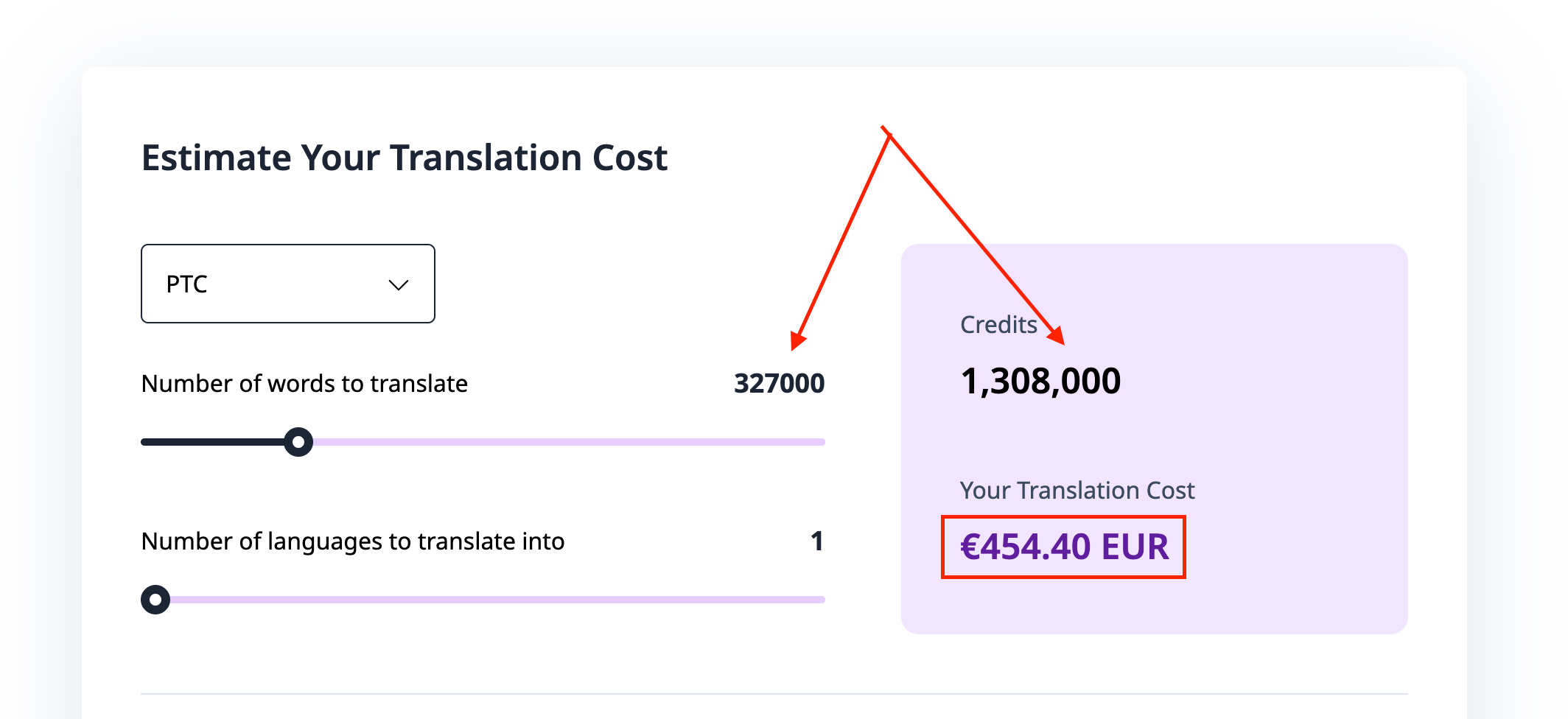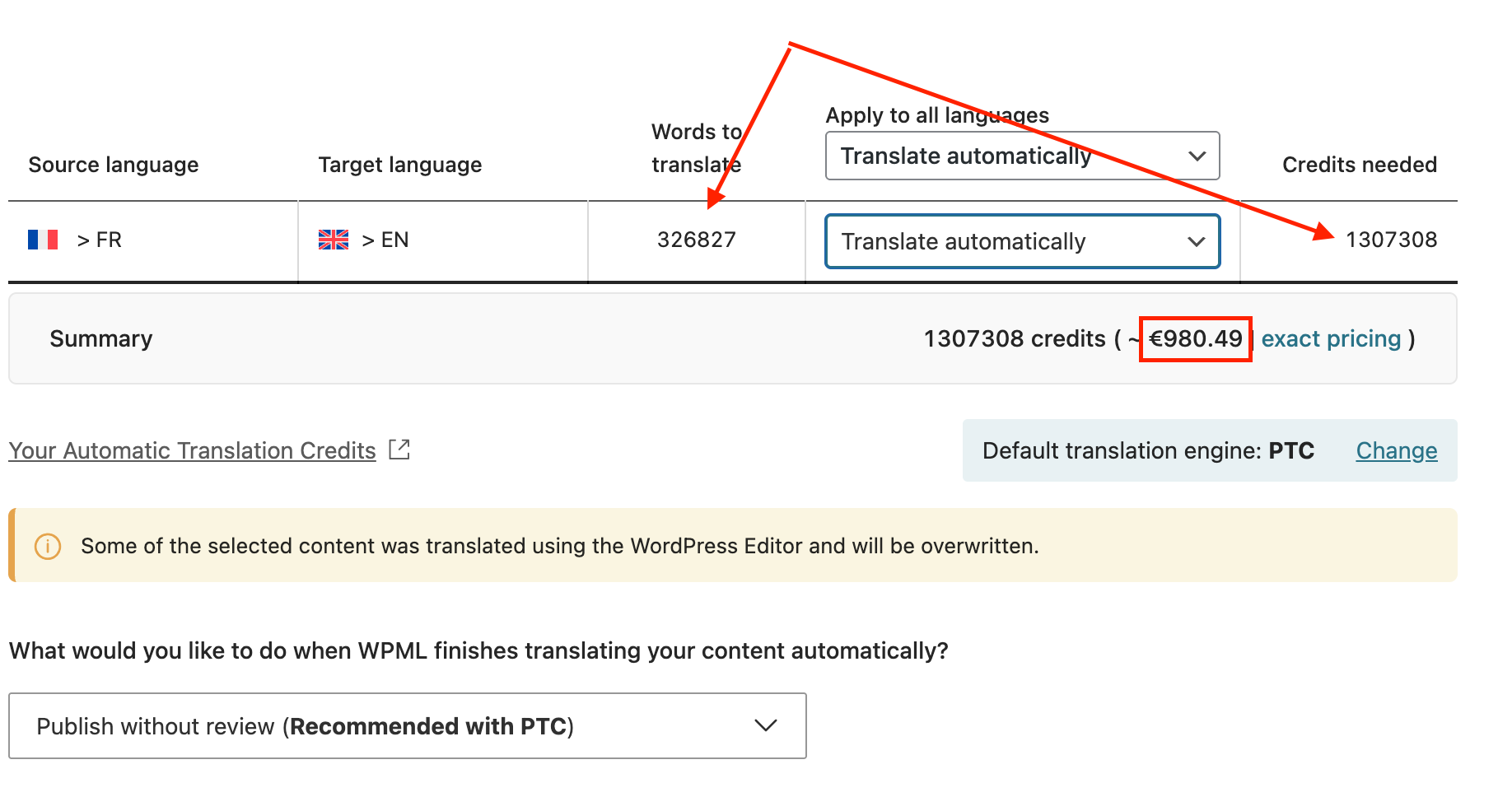 I'm trying to estimate the cost to translate a whole website using WPML. I evaluated the cost through the Translation Dashboard by selecting all the pages and the PTC Engine, which gave me 326827 words to translate with a cost of 980€. However, when I checked the cost on your calculation page for 327000 words to translate with PTC in 1 language, the cost is 456,40€.