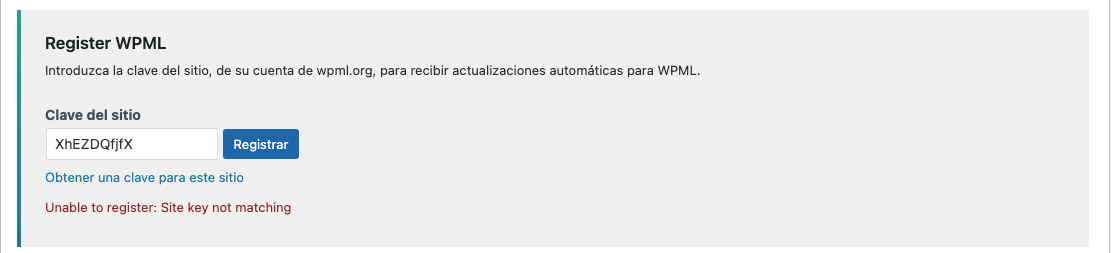 Tengo una clave de licencia que obtengo de mi cuenta de WPML que me ha transferido un proveedor para el site url: enlace oculto. Cuando intento introducir la clave en la ruta /wp-admin/plugin-install.php?action=register&repository=wpml&tab=commercial, me sale un mensaje de error.