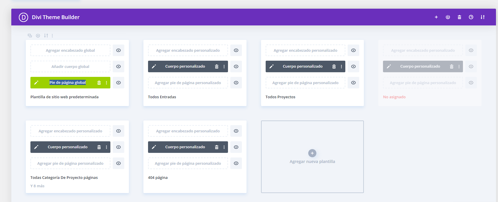 Para hacer que el nuevo footer se replicase en todas las paginas se creó una plantilla en la Biblioteca de Divi, se procedió a realizar las traducciones mediante duplicados para cada idioma y luego esa plantilla llamada "Footer nuevo global" se le asignó en el Theme Builder a la "plantilla de sitio web predeterminada" para que apareciese ese footer en toda la web. A pesar de que estaban hechas las traducciones, solo mostraba el castellano en todos los idiomas.