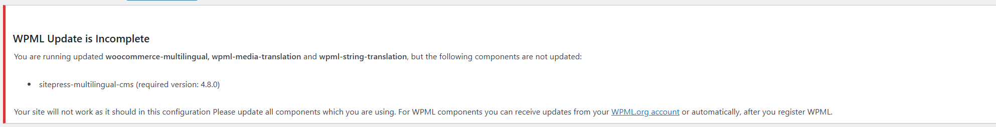 I expected to see no error message, but instead, I got: 'WPML Update is Incomplete. You are running updated woocommerce-multilingual, wpml-media-translation, and wpml-string-translation, but the following components are not updated: sitepress-multilingual-cms (required version: 4.8.0). Your site will not work as it should in this configuration. Please update all components which you are using. For WPML components, you can receive updates from your WPML.org account or automatically, after you register WPML.'