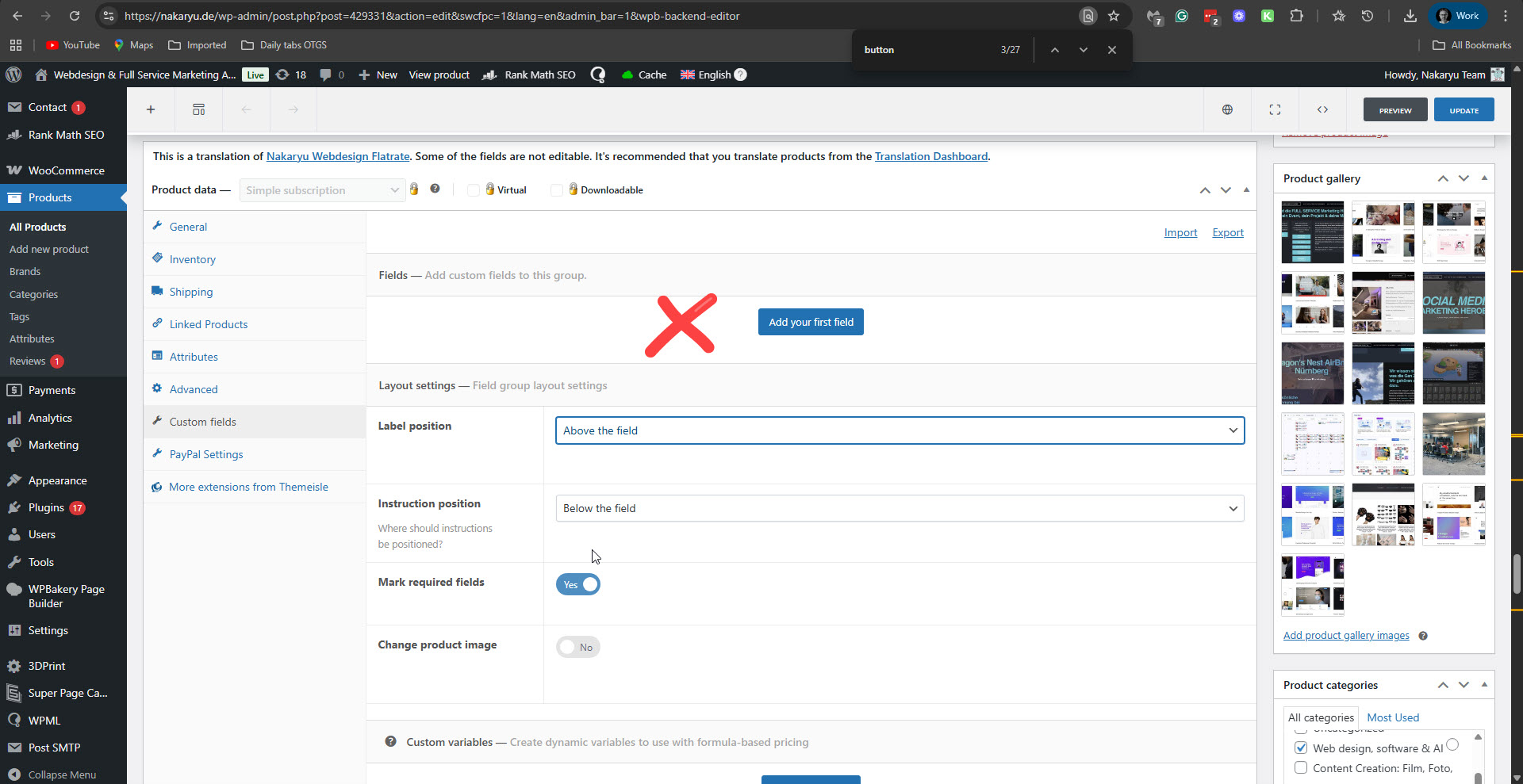 Hi again. Our compatibility expert provides further explanation of the situation on your site. - The page is not using the "produkt kopie" block but the product content built with WPBakery. - The missing section is actually a WooCommerce button: hidden link - Inside the button, they display custom fields from the plugin WooCommerce Advanced Fields (WAF): hidden link - Plugin listing: https://wpml.org/plugin/advanced-product-fields-for-woocommerce/ - Since the product is already translated and it's a very long page, I would rather recommend editing the English translation in the WordPress editor to add those custom fields manually. I went ahead and checked the English translation of the product, and I could see that the fields are missing there. Please see the attached screenshot. This is where you need to add them, similar to the German product. Screenshot:hidden link. This should resolve the problem with that section. I want to remind you that in our previous ticket regarding this issue, I already mentioned the recommended approach (as outlined in the Advanced Product Fields for WooCommerce plugin documentation) for translating products with fields. Please see it here: https://wpml.org/forums/topic/split-advanced-product-fields-addons-fields-issue/#post-17199192. We hope that this information will help you solve this problem. Regards, |