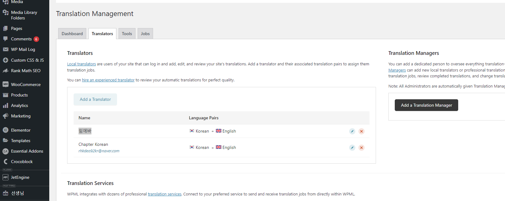 On WPML > Translation Management > Translator is a user called "임에바" registered as a translator and this user does not have an e-mail address in the profile.