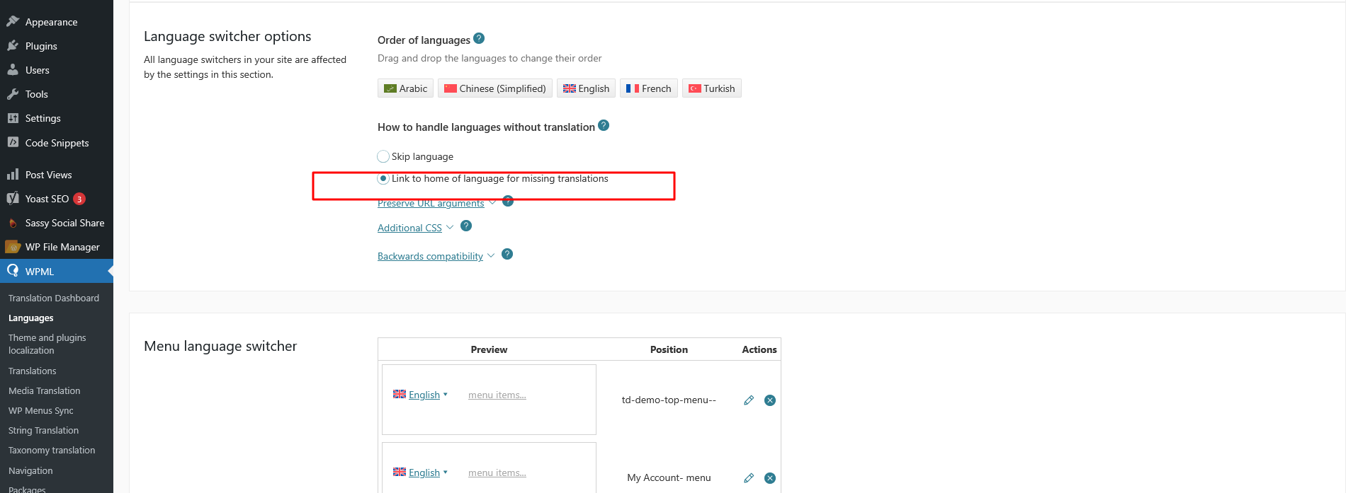 My apologies for the delay in answering. As I mentioned earlier, on my test site, WPML will not display language options inside the language switcher if an author page has no posts. In your case, you see a language option, as at WPML > Settings > Post Types Translation, the type "Posts" is set to "Translatable use translation if available or fallback to default language". Your example author only has one post in Arabic: If I now use the language switcher on this page to switch to another language, I will always land on the respective homepage. This is expected as long as the archive has no posts. You can use this hook to solve this issue: Example for placing into your Code Snippets plugin:
