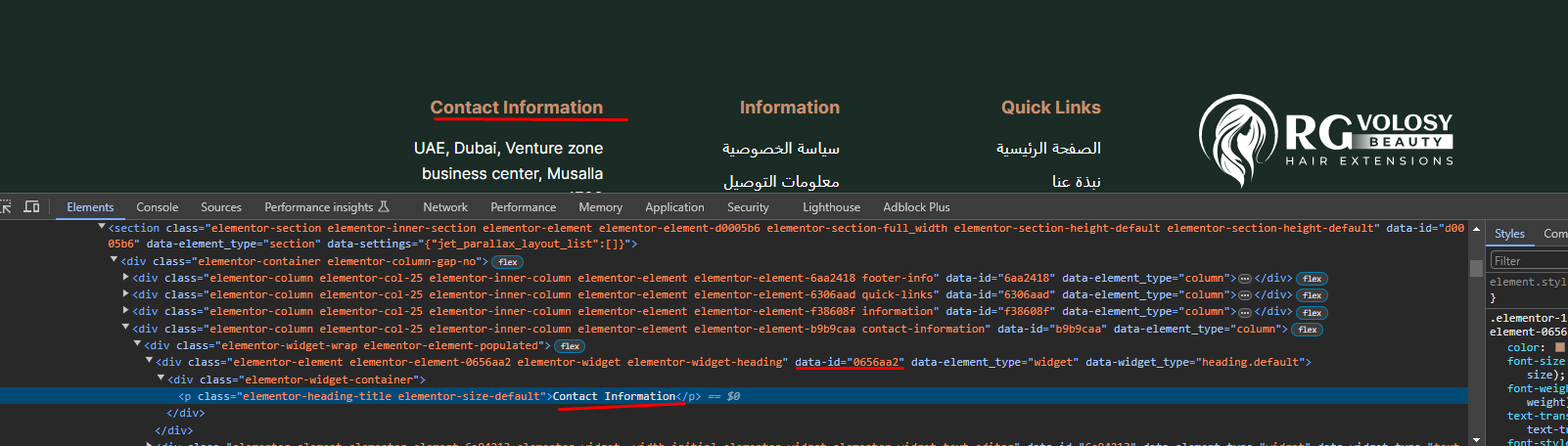You need to translate the menu headings in the footer, the button in the form, and all pages related to the store. The site uses an additional Elementor plugin, and you are unable to see options to create another version for the Arabic language and link it with the English version. Additionally, the automatic translation is not functioning as expected.