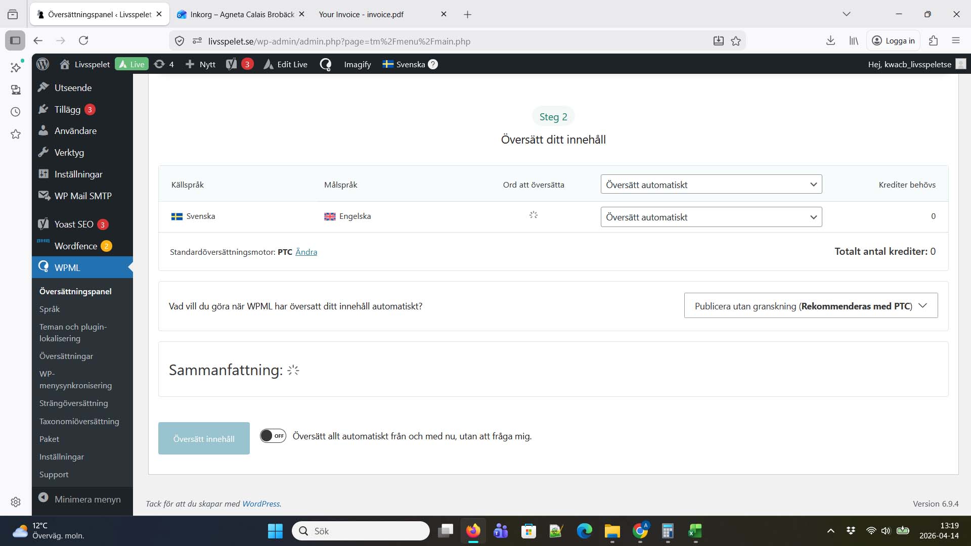 I assume when you say ATE - you are referring to "Avancerad översättningsredigerare" (Swedish) which would translate to Advanced Translation Editor? It's when I try to translate new content (a new part of a novel) that nothing happens when I choose the page and click translate content. It just spins and doesn't give me an estimated value of credits. As I said in my ticket - this has worked fine until I changed to option to translate all new content automatically. That didn't work so then I turned that option off and now I can't request translation as I could before. |