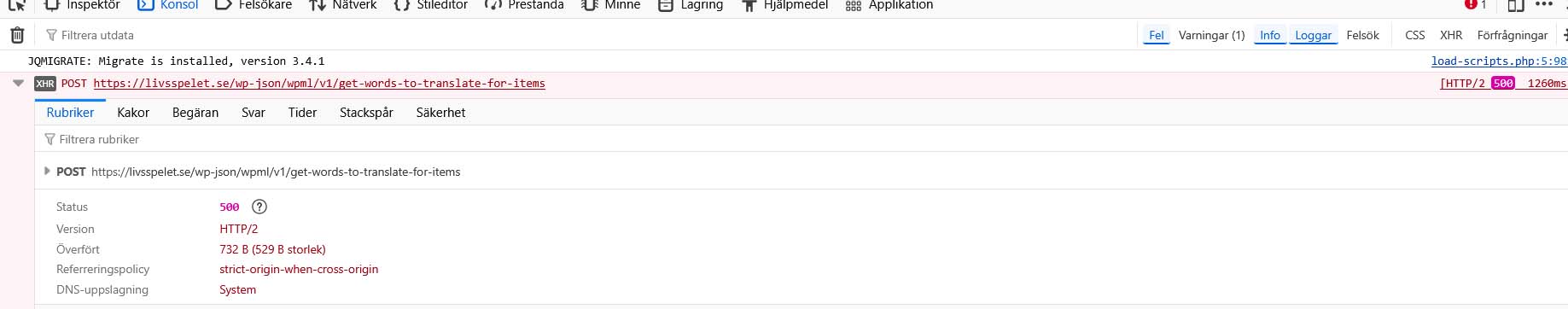 I see, it most likely started trying to translate automatically and then an error triggers. If it's not listed in that ATE Error log, then it most likely is an err 500. Can you please try again, right click -> inspect and review the console tab for any errors logged? Also, go in your wp-config.php file and look for define(‘WP_DEBUG’, false);. Change it to: Edit your wp-config.php file and add these lines, just before it says 'stop editing here': ini_set('log_errors',TRUE); This will create an error_log.txt file in your site's root directory. Please send me its contents. |