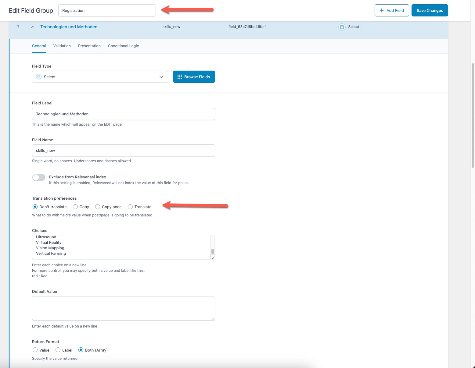 After changing the translation mode or translation preference for the field, please update the registration post in the default language and its translation.