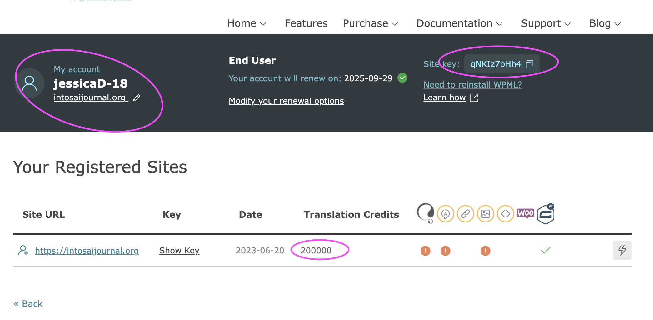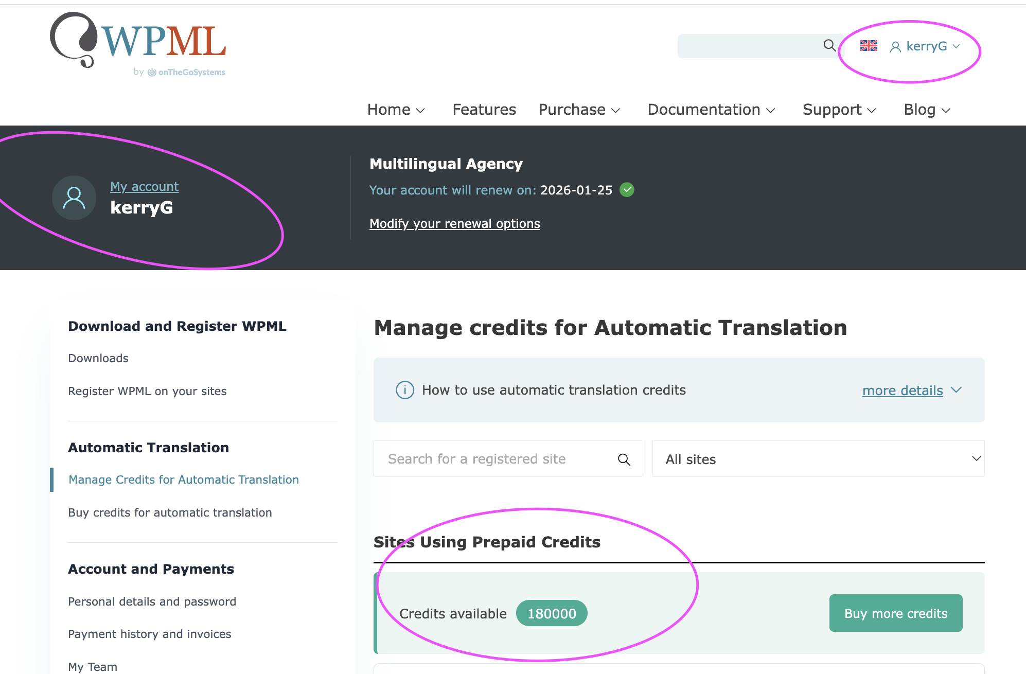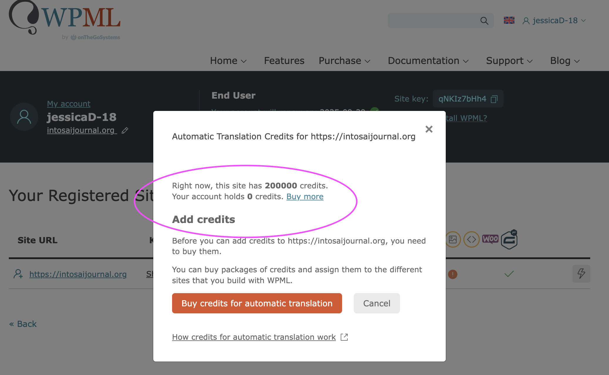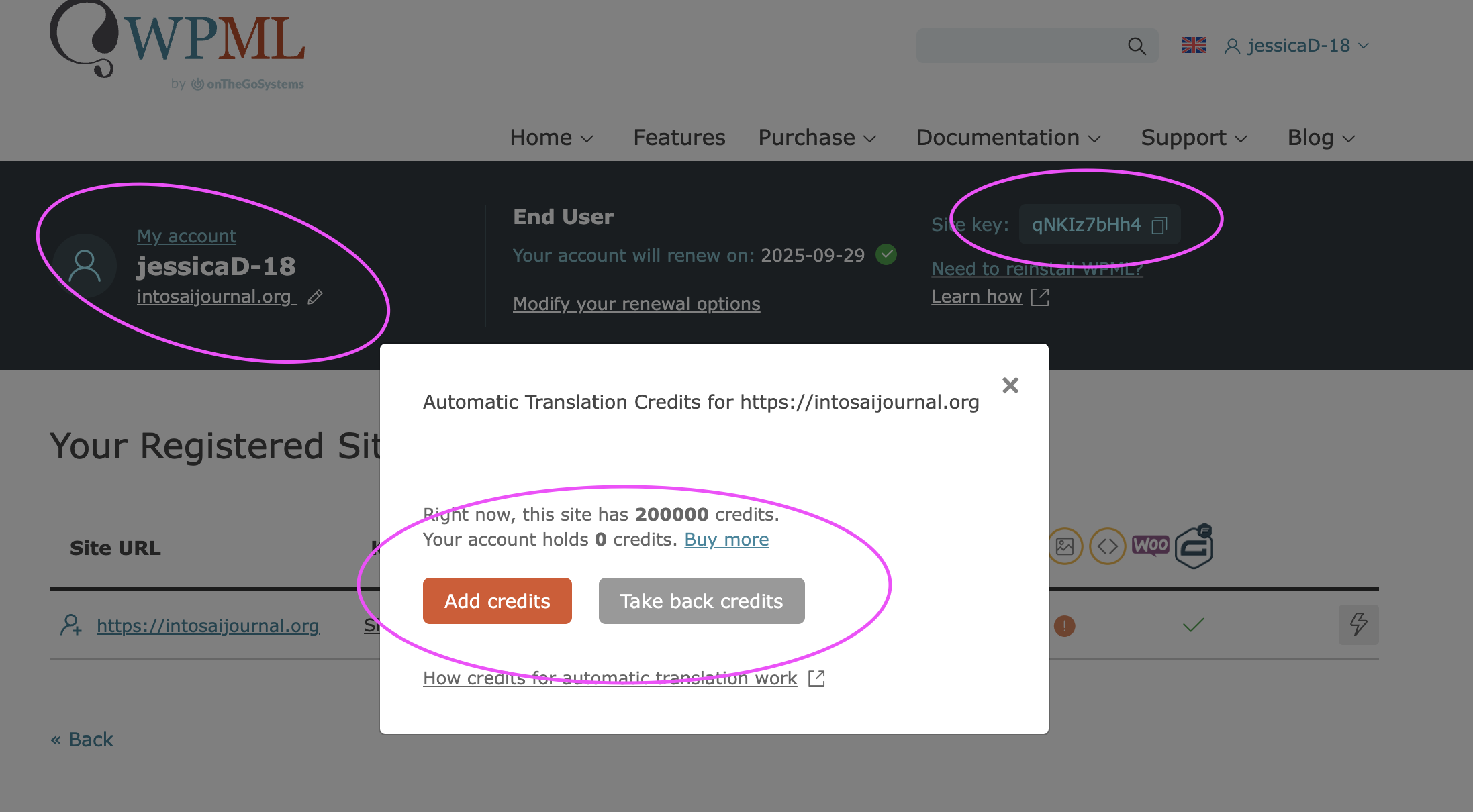 My site shows that I have 296 credits but I am unable to add more through my WPML account. This is an affiliate account from our main account that belongs to Kerry Gunther, usrname: kerryG. The sites appear under the kerryG account but we have no control over it. The jessicaD-18 account controls the purchase and assigning of credits.