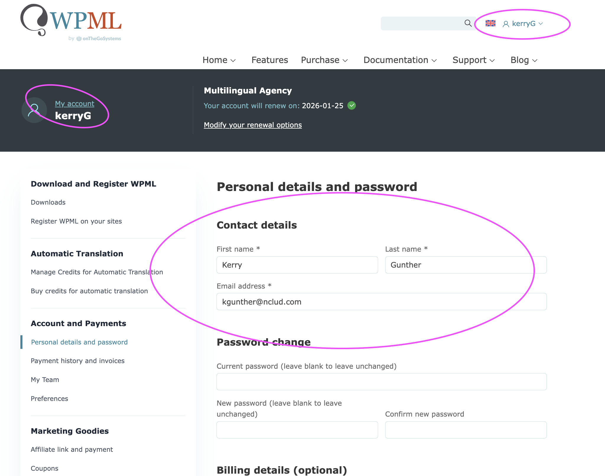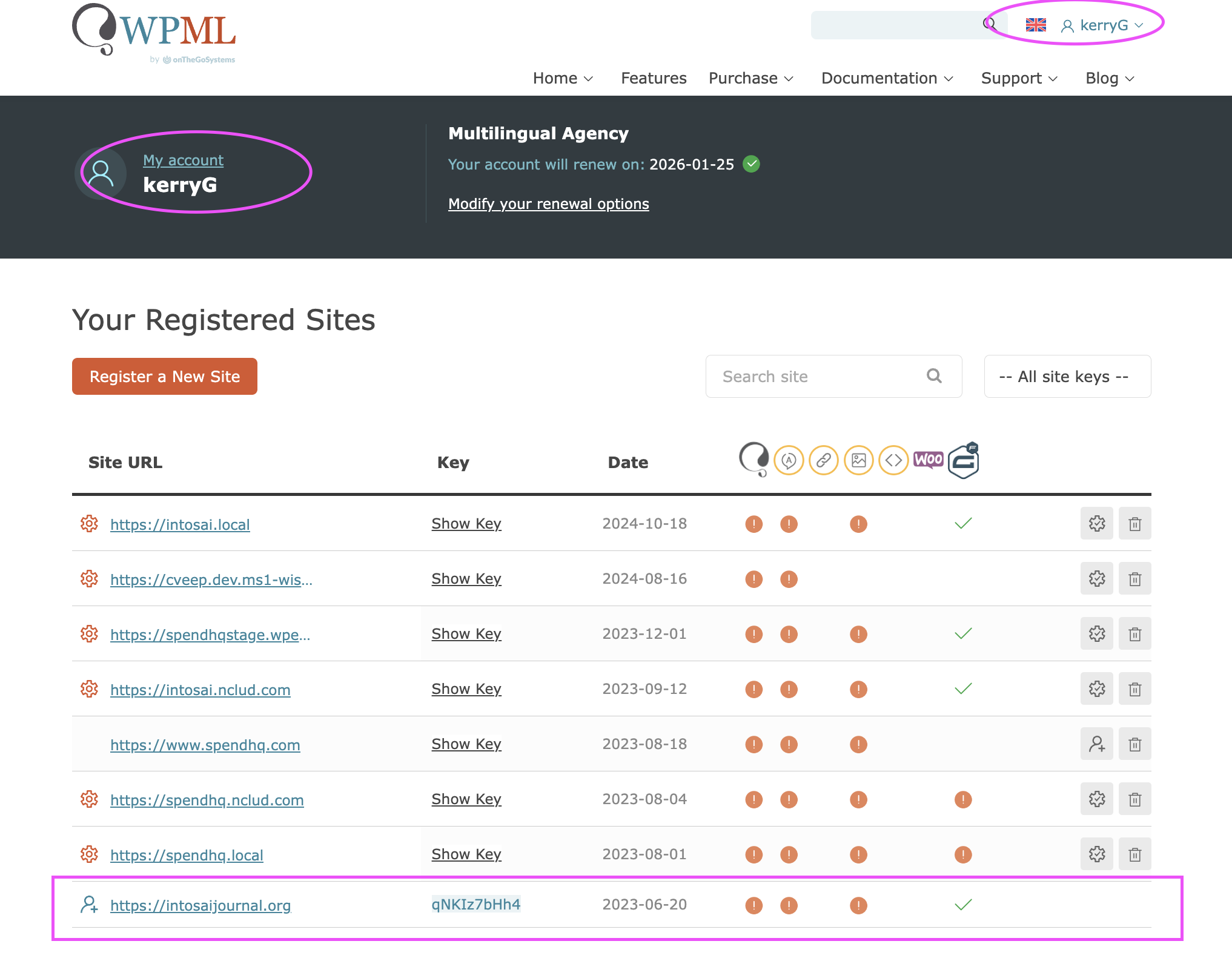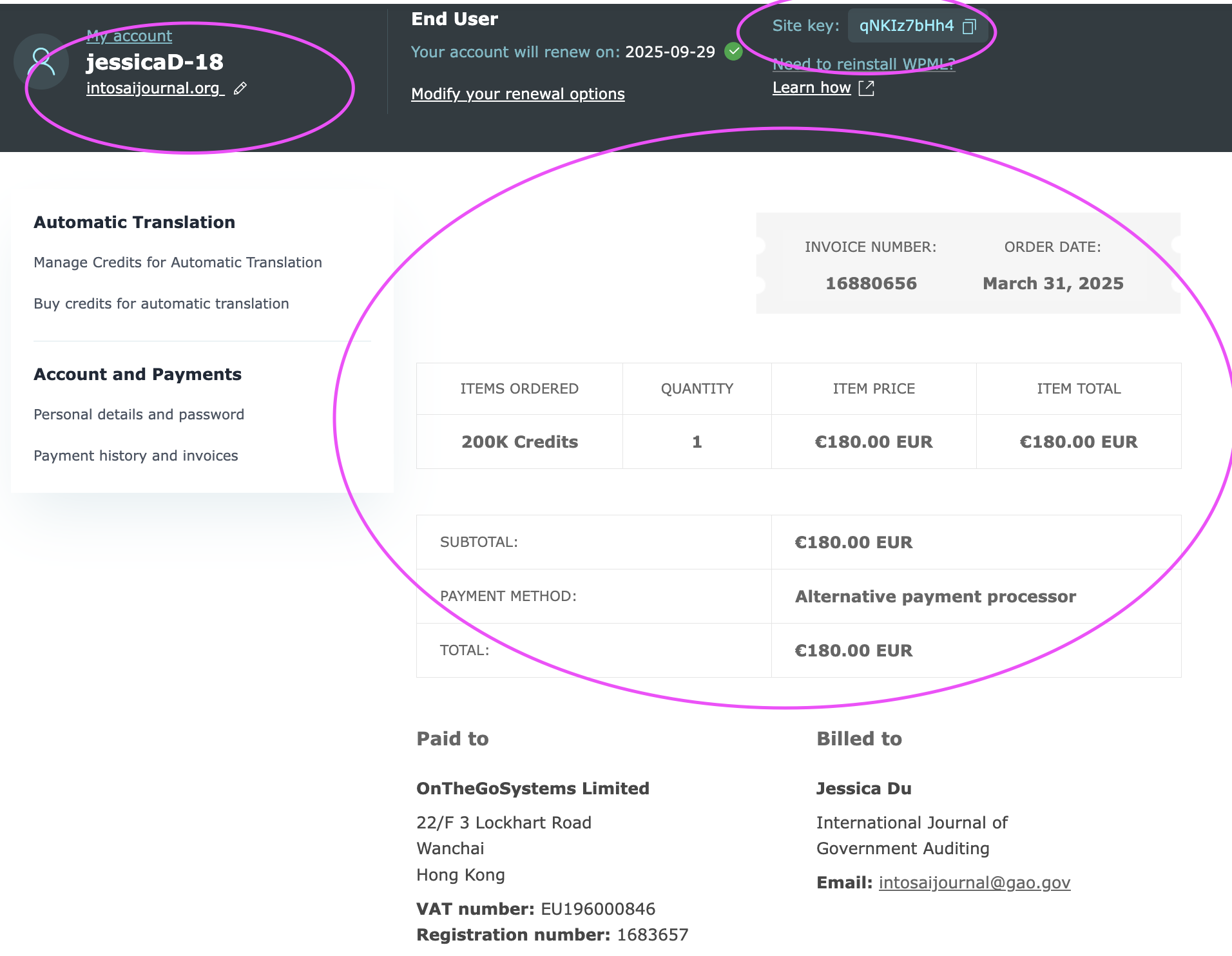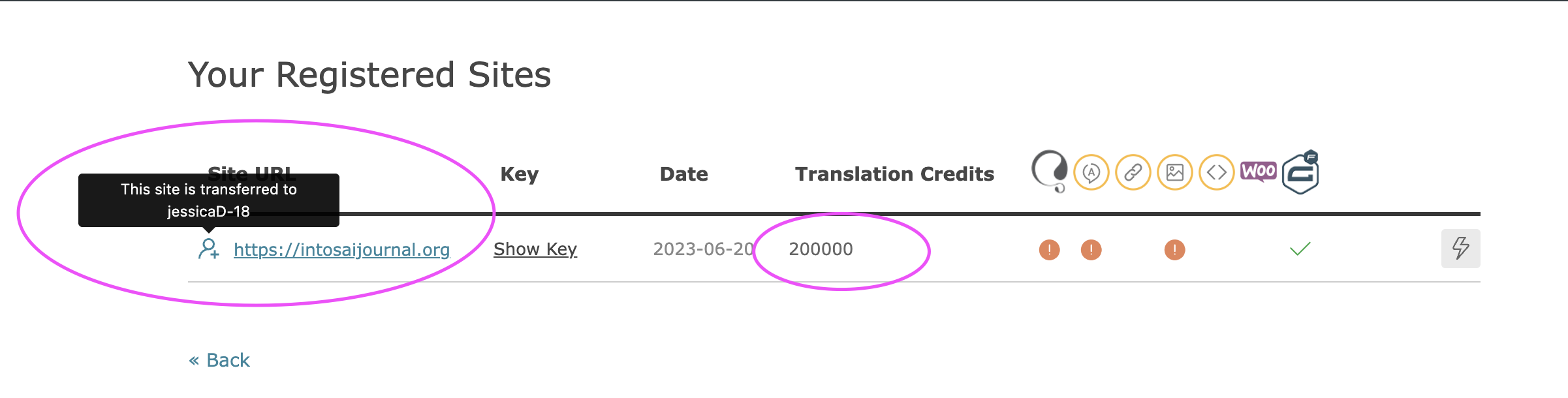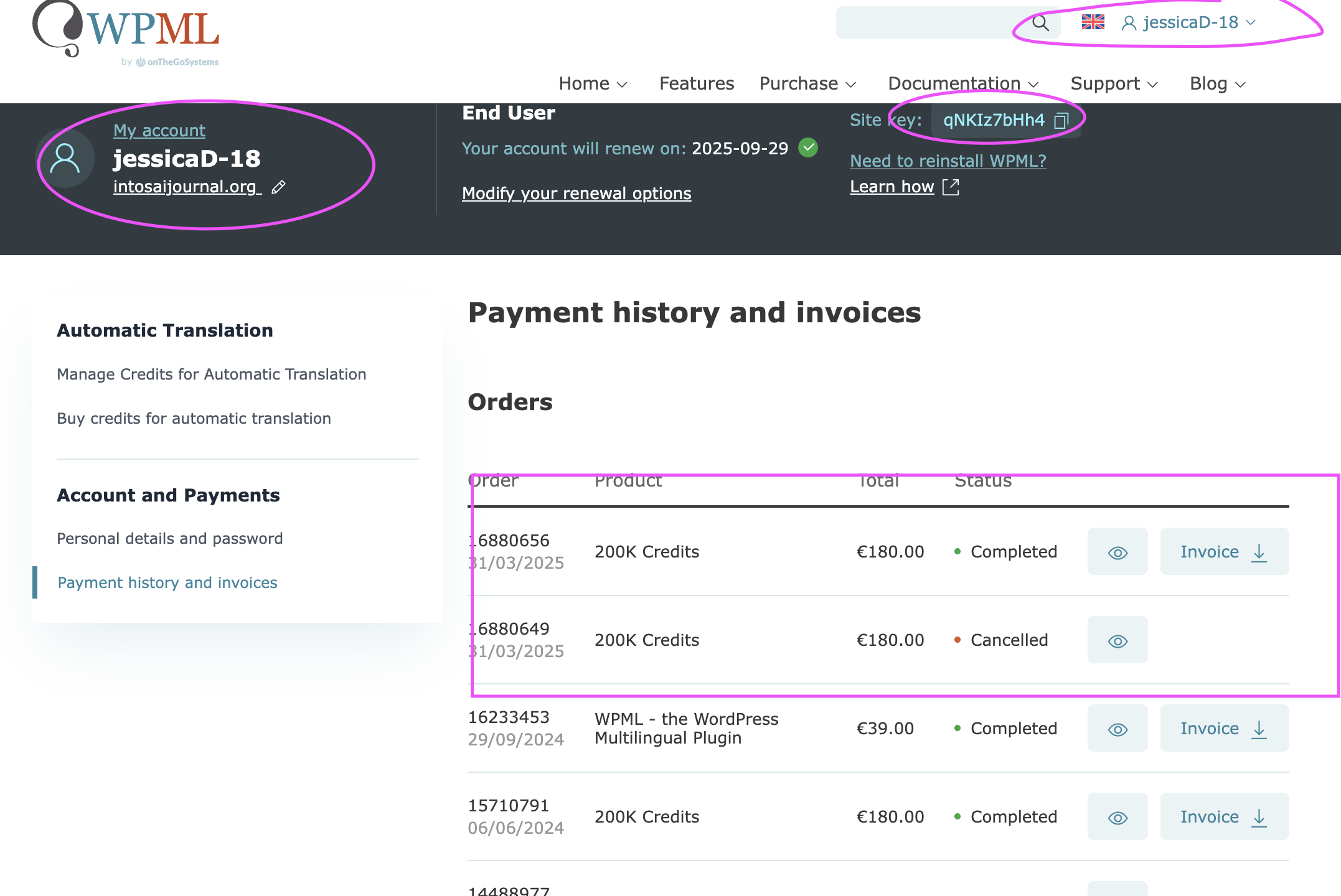 My site shows that I have 296 credits but I am unable to add more through my WPML account. This is an affiliate account from our main account that belongs to Kerry Gunther, usrname: kerryG. The sites appear under the kerryG account but we have no control over it. The jessicaD-18 account controls the purchase and assigning of credits.