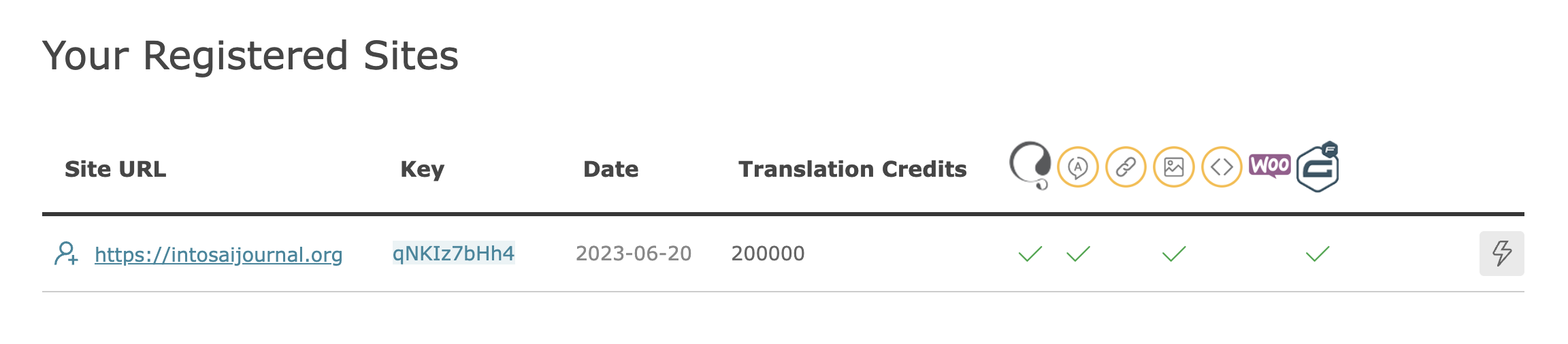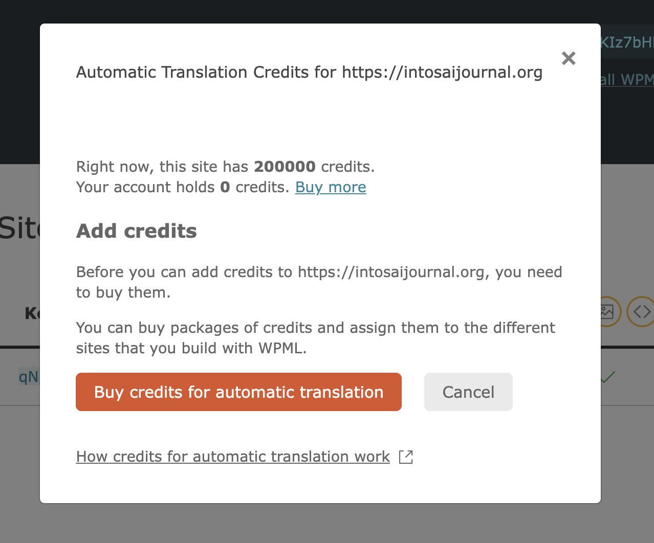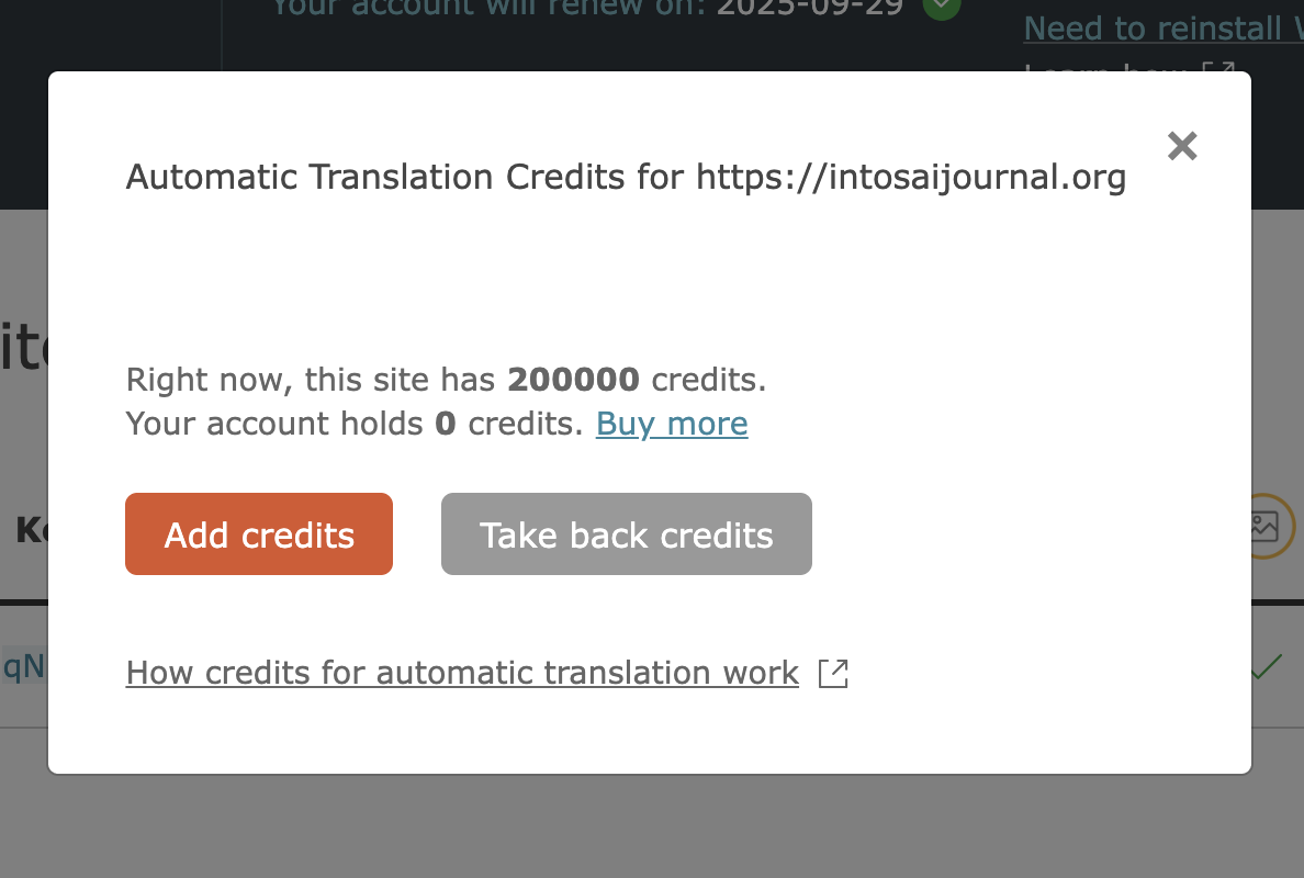 When I click 'Manage Translation Credits' for the site within my WPML account, the following message is shown: 'Right now, this site has 200000 credits. Your account holds 0 credits. "Buy More" or "Take back credits"'.