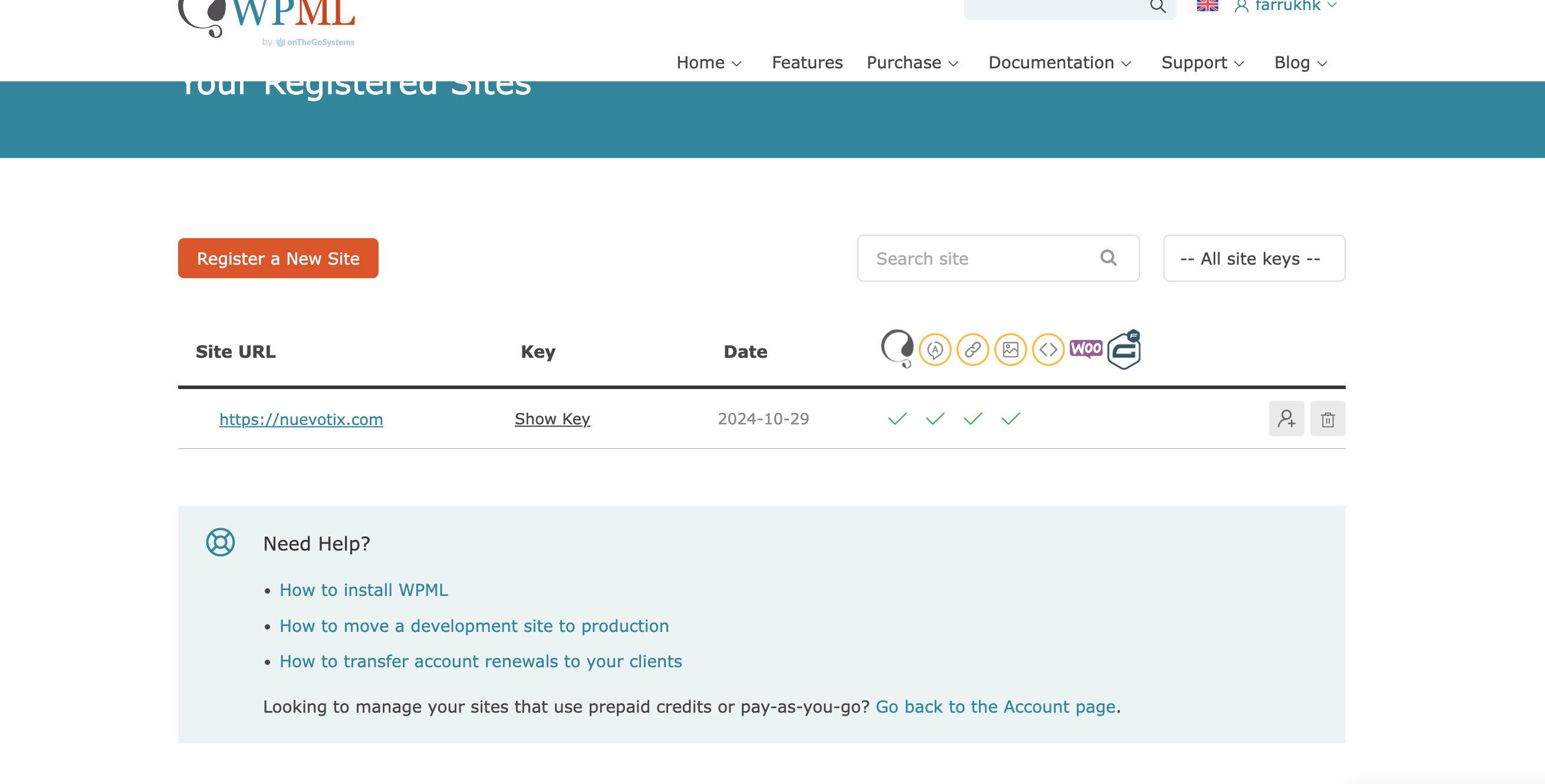 We have confirmed that the license key and site configuration are correctly set up in the client's WPML account. The beta domain has been removed, and no further action is required regarding the license key. If the beta domain still appears or if there are issues with the site key, the client can manage and remove any unnecessary translation credits from the site by visiting their WPML account at https://wpml.org/account/sites/.