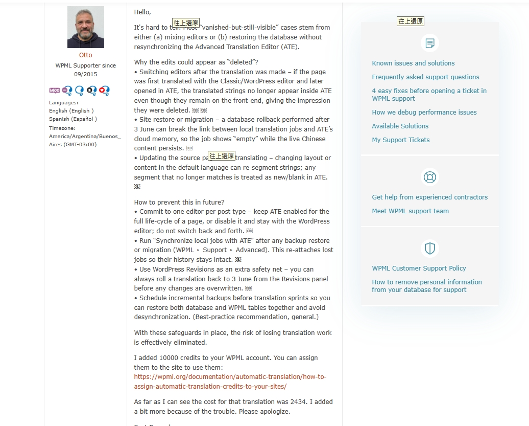 Hi, Below link, I believed this post was translated with ATE which is suggested by WPML on 6/6. And WPML mentioned they will return the credits if it deducted our credits. hidden link I wanted to ask if you could restore our old manually translated Chinese for this post? And where can I check if those credits were returned or not? |