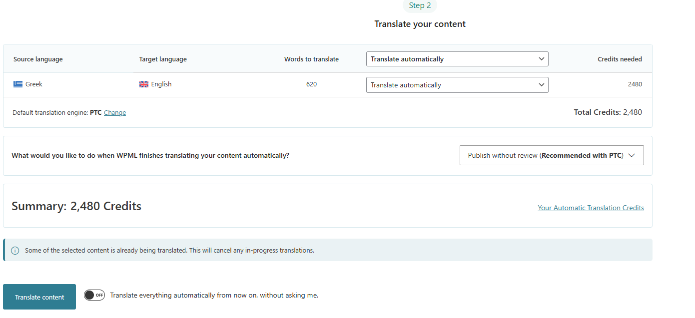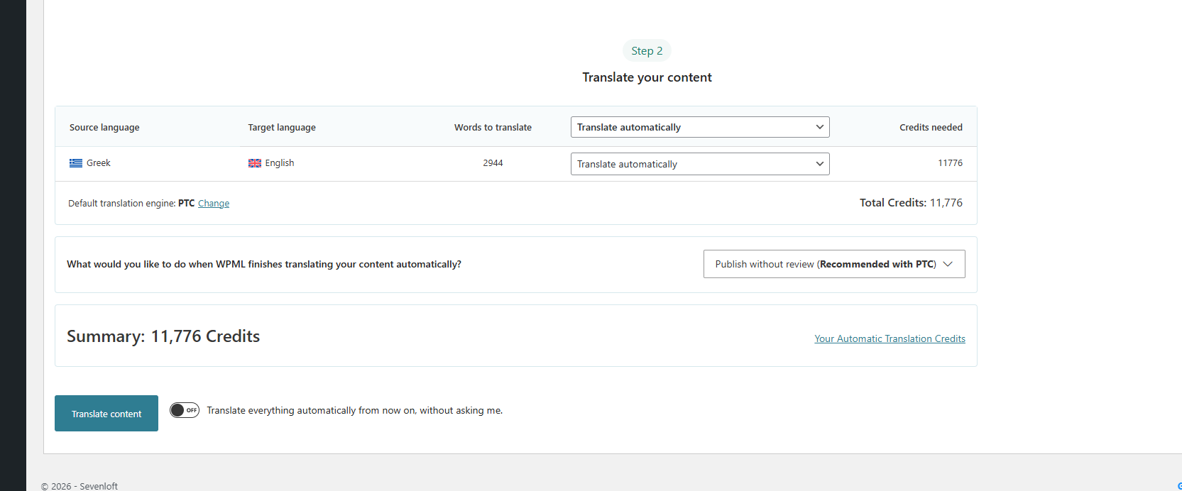 Good evening, we purchased 500,000 credits to translate our products using automatic translation with the PTC engine. After translating around 200 products, we noticed something concerning regarding credit consumption. From discussions with Maya and also from your website, you refer to “translation memory,” which, however, seems to be behaving strangely. Let me clarify what I mean. In my example, I refer to a specific product, but I have noticed this with others as well. When going to WPML > Translation Dashboard and sending the product for automatic translation, it was asking for 11,776 credits for the translation (see translation dashboard.png). However, if I try to translate the product directly (by clicking the “+”), it only asks for 644 credits, and most of the fields are already translated, which means that the “translation memory” actually works. (see ate,png) As you can understand, the difference in credits is very large and definitely something doesnt work as it should. |