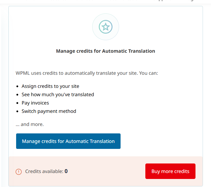 The client recently purchased the Multilingual CMS plan with 90,000 automatic translation credits but found that their account shows 0 available credits and only 48 credits assigned. They were unable to find or activate the included credits in their WPML account.
