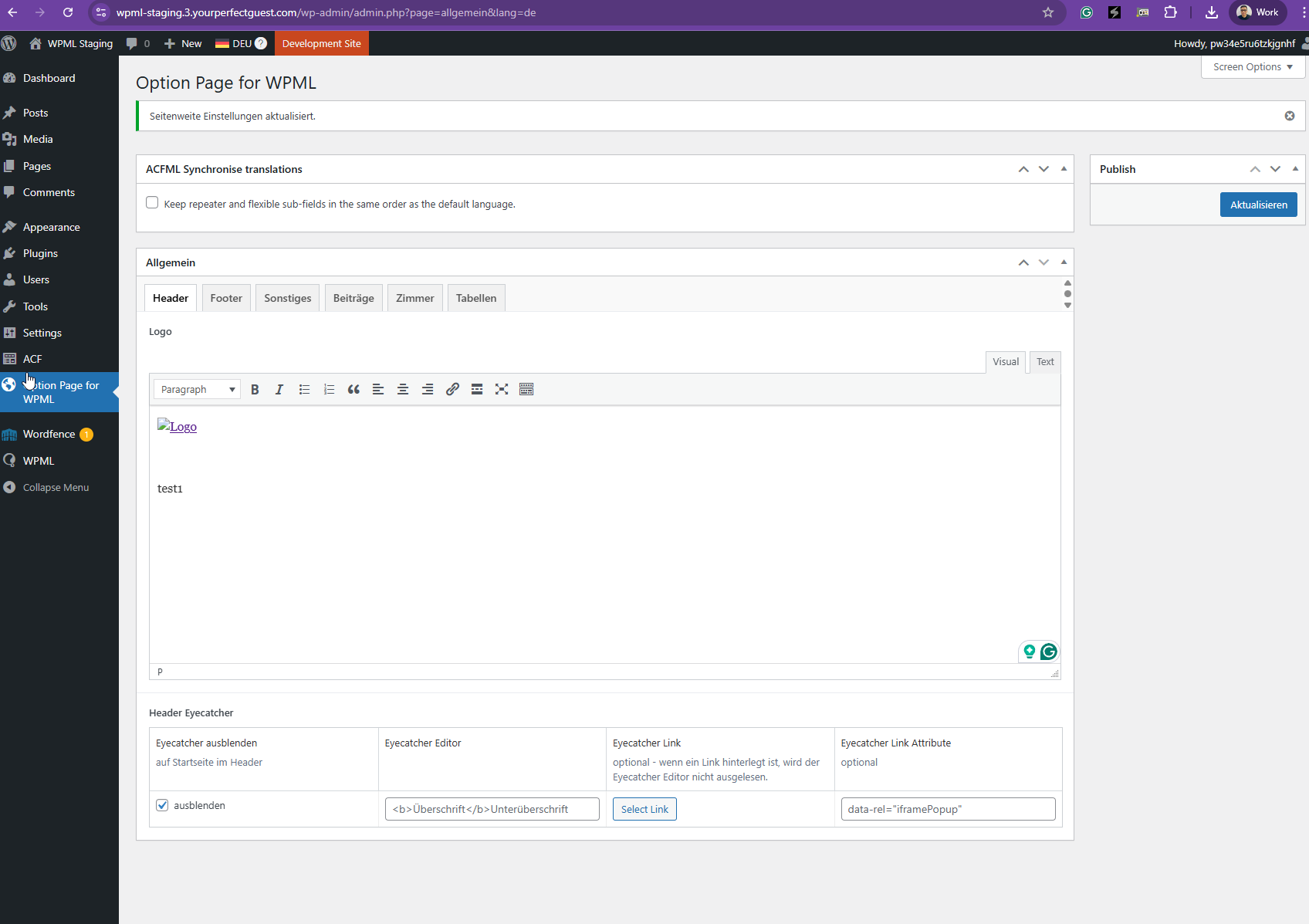 Would it be possible to use our staging environment instead? The issue is already reproducible there. On your sandbox, I would first need to configure a large number of WPML settings to match our setup before I could even start reproducing the problem. Since our staging environment already mirrors the full configuration, it would be much more efficient to investigate the issue there. You can access the staging site here: I’ve also enabled debug mode on our staging environment so that your 2nd level support / developers can directly review detailed logs if needed. Please let me know if that works for you. Thanks a lot! |