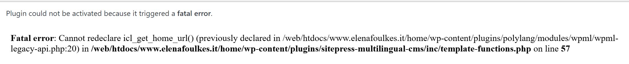 I received an error message: 'Plugin could not be activated because it triggered a fatal error.' The specific error is: 'Fatal error: Cannot redeclare icl_get_home_url() (previously declared in /web/htdocs/www.elenafoulkes.it/home/wp-content/plugins/polylang/modules/wpml/wpml-legacy-api.php:20) in /web/htdocs/www.elenafoulkes.it/home/wp-content/plugins/sitepress-multilingual-cms/inc/template-functions.php on line 57.'