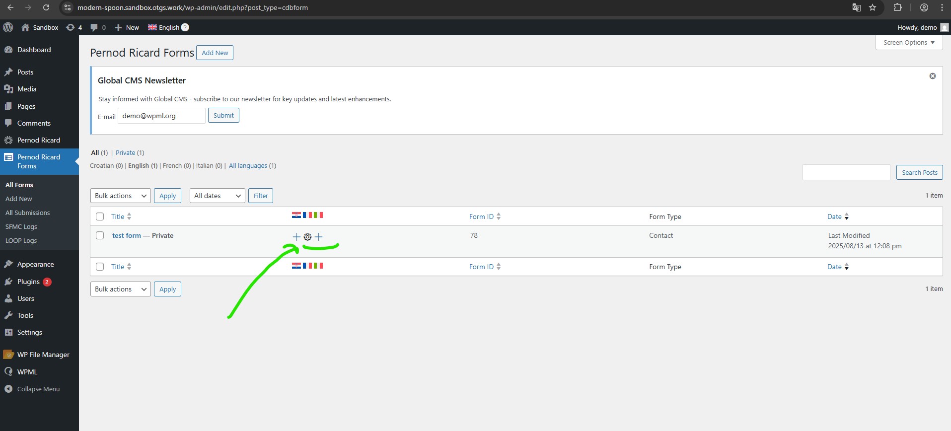 on this page hidden link click on the "+" link as if you wanted to translate the test form, you will get the fatal error that I mentioned at the beginning of my thread, then if you go back you will have the gear icon, but from there we have no way or workaround for translating the post.
